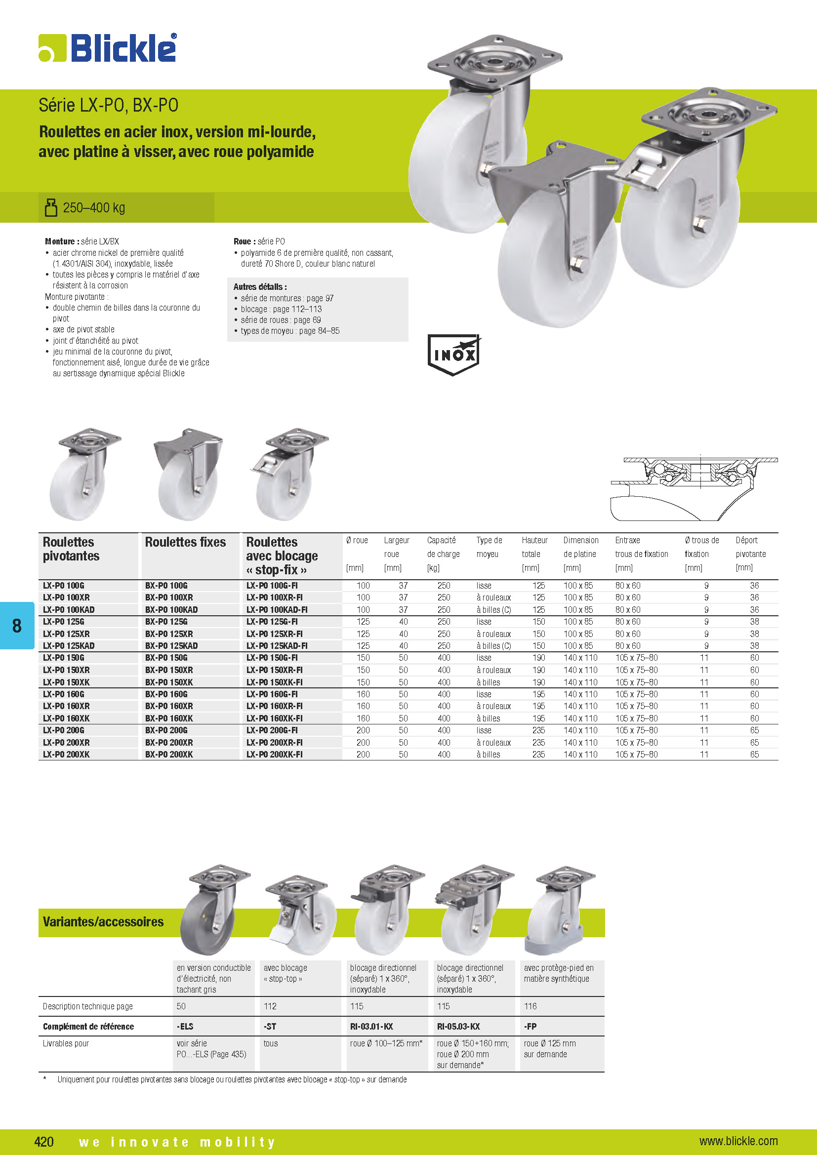 LX-PO, BX-PO Stainless steel castors, medium-duty design, with top plate, with nylon wheel