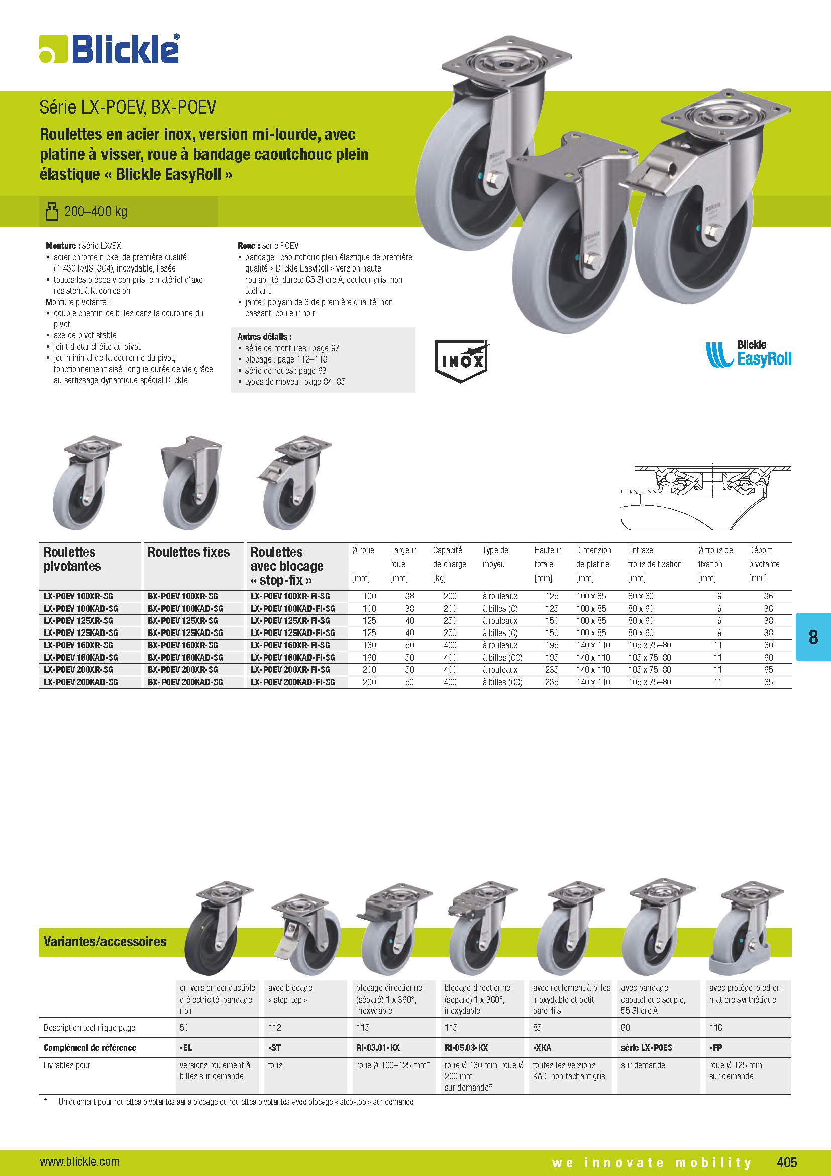 LX-POEV, BX-POEV Roulettes en acier inox, version mi-lourde, avec platine à visser, roue à bandage caoutchouc plein élastique Blickle EasyRoll