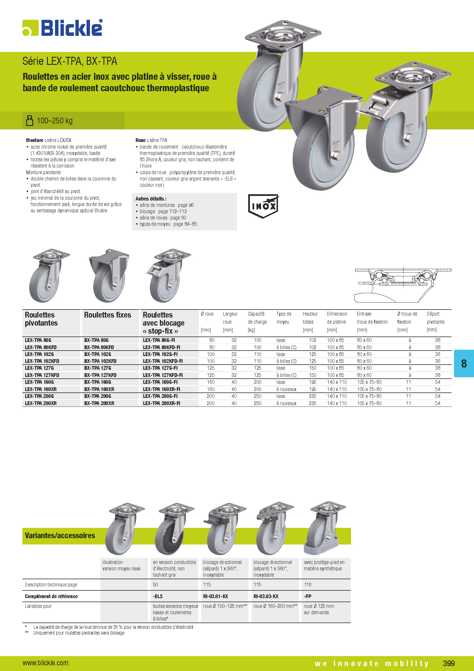 LEX-TPA, BX-TPA Roulettes en acier inox avec platine à visser, roue à bande de roulement caoutchouc thermoplastique