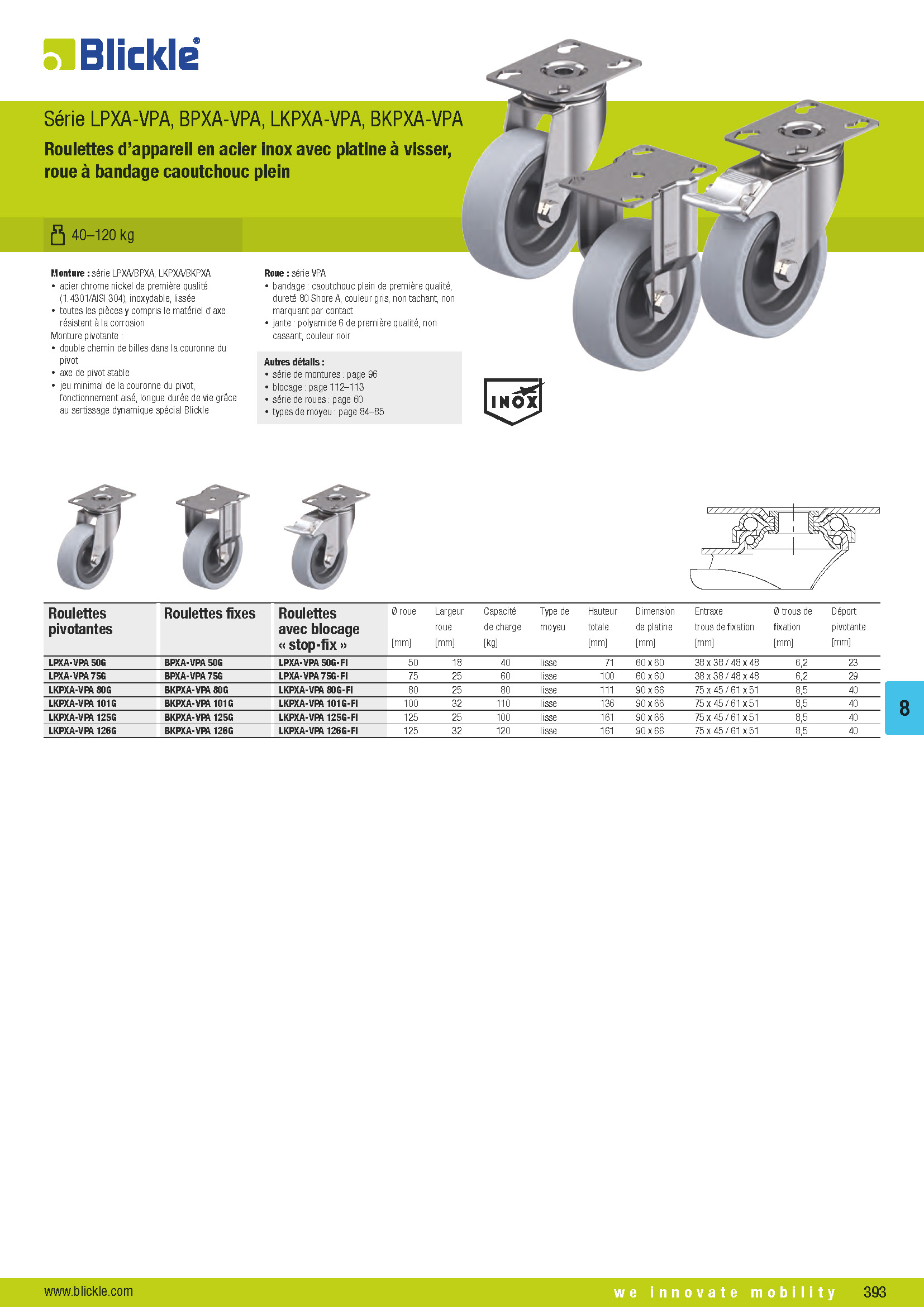 LPXA-VPA, BPXA-VPA, LKPXA-VPA, BKPXA-VPA Roulettes d’appareil en acier inox avec platine à visser, roue à bandage caoutchouc plein
