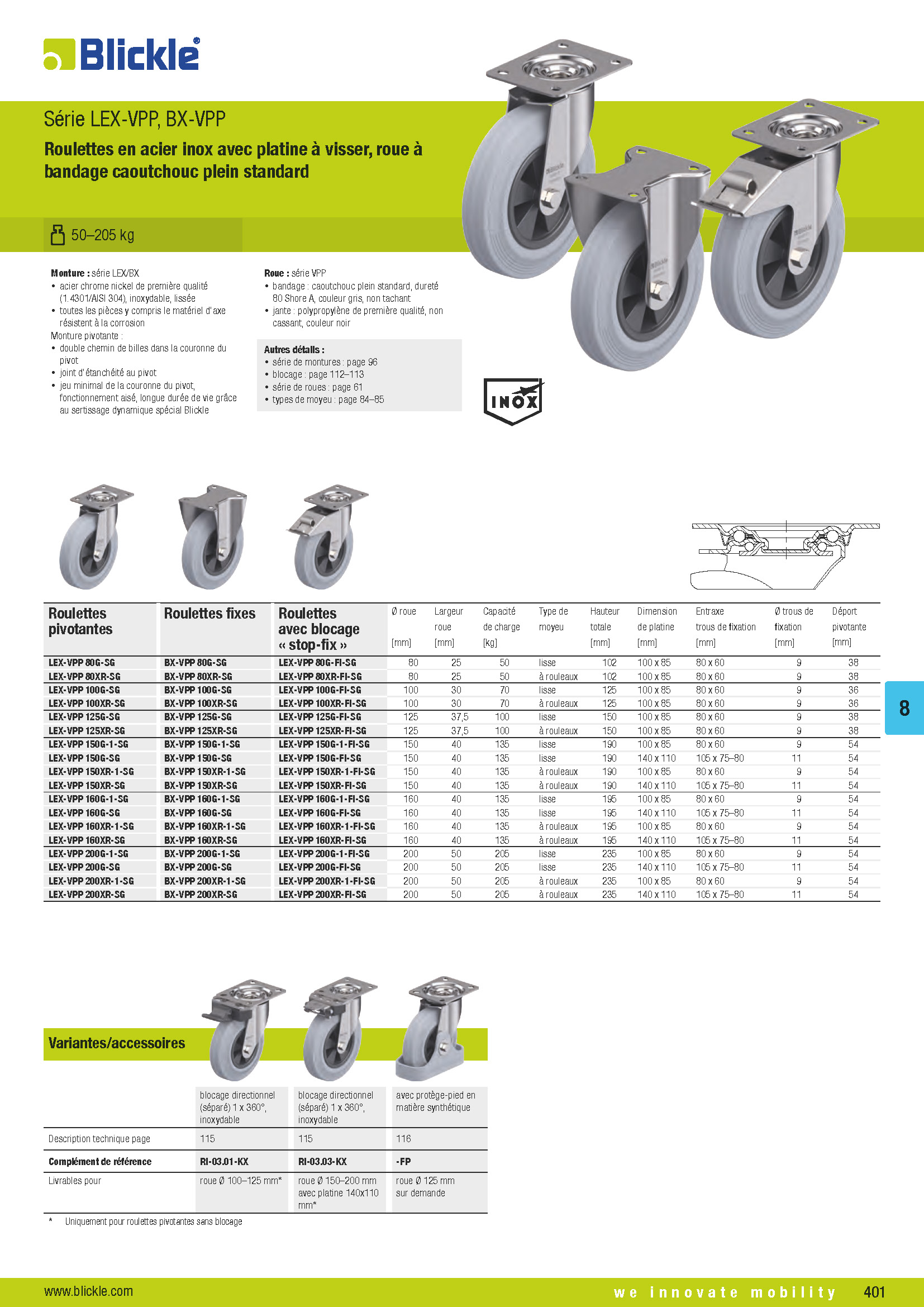 LEX-VPP, BX-VPP Roulettes en acier inox avec platine à visser, roue à bandage caoutchouc plein standard