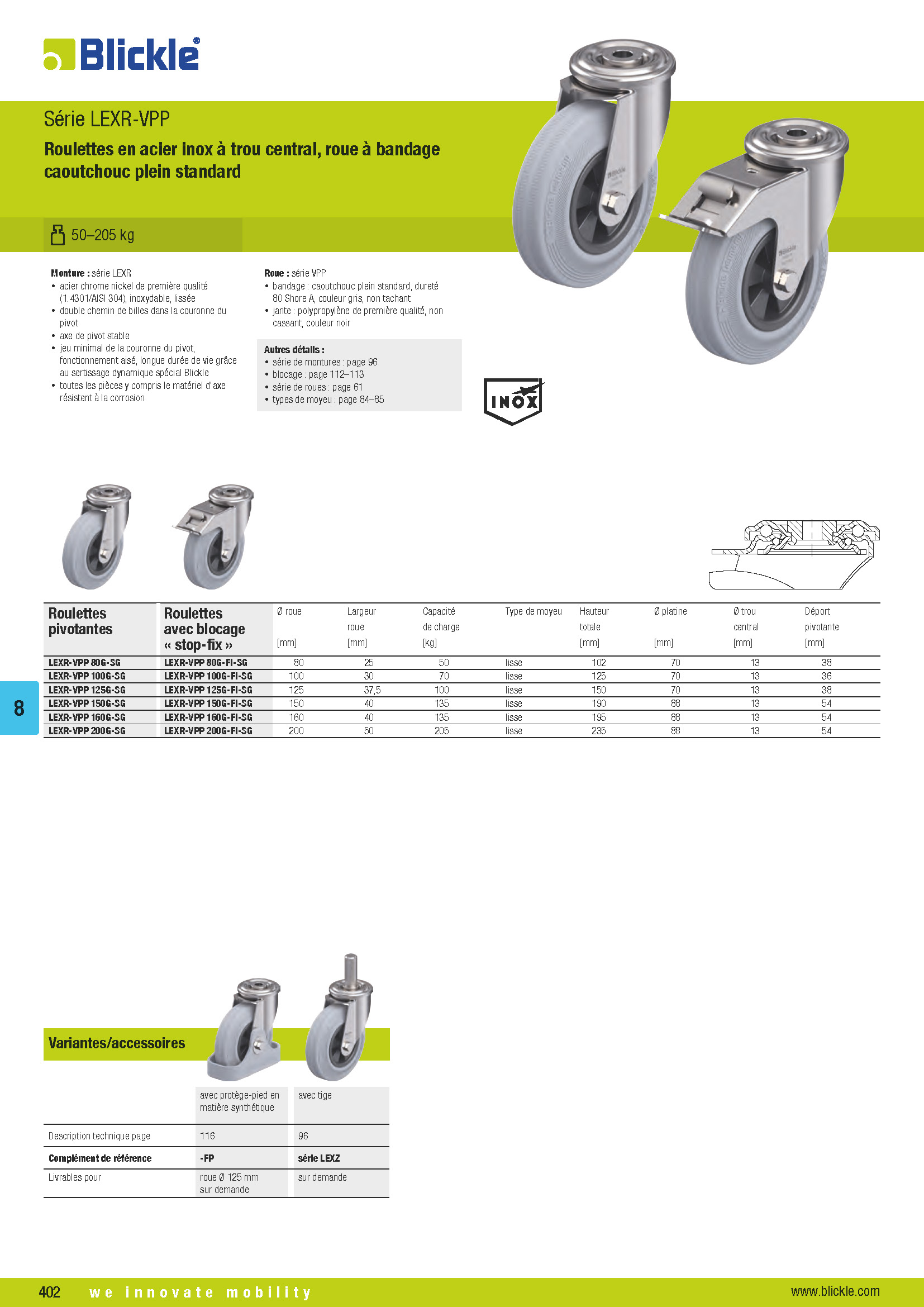 LEXR-VPP Roulettes en acier inox à trou central, roue à bandage caoutchouc plein standard