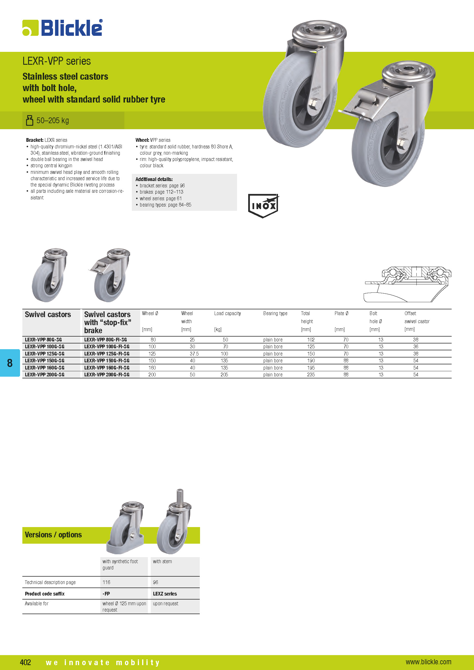LEXR-VPP Stainless steel castors with bolt hole, wheel with standard solid rubber tyre