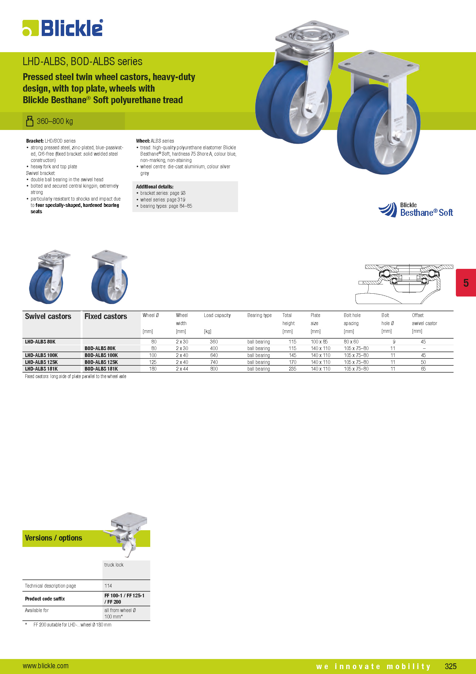 LHD-ALBS, BOD-ALBS Stahlblech-Doppelrollen, Schwerlast- Ausführung, mit Anschraubplatte, Räder mit Polyurethan-Laufbelag Blickle Besthane Soft®