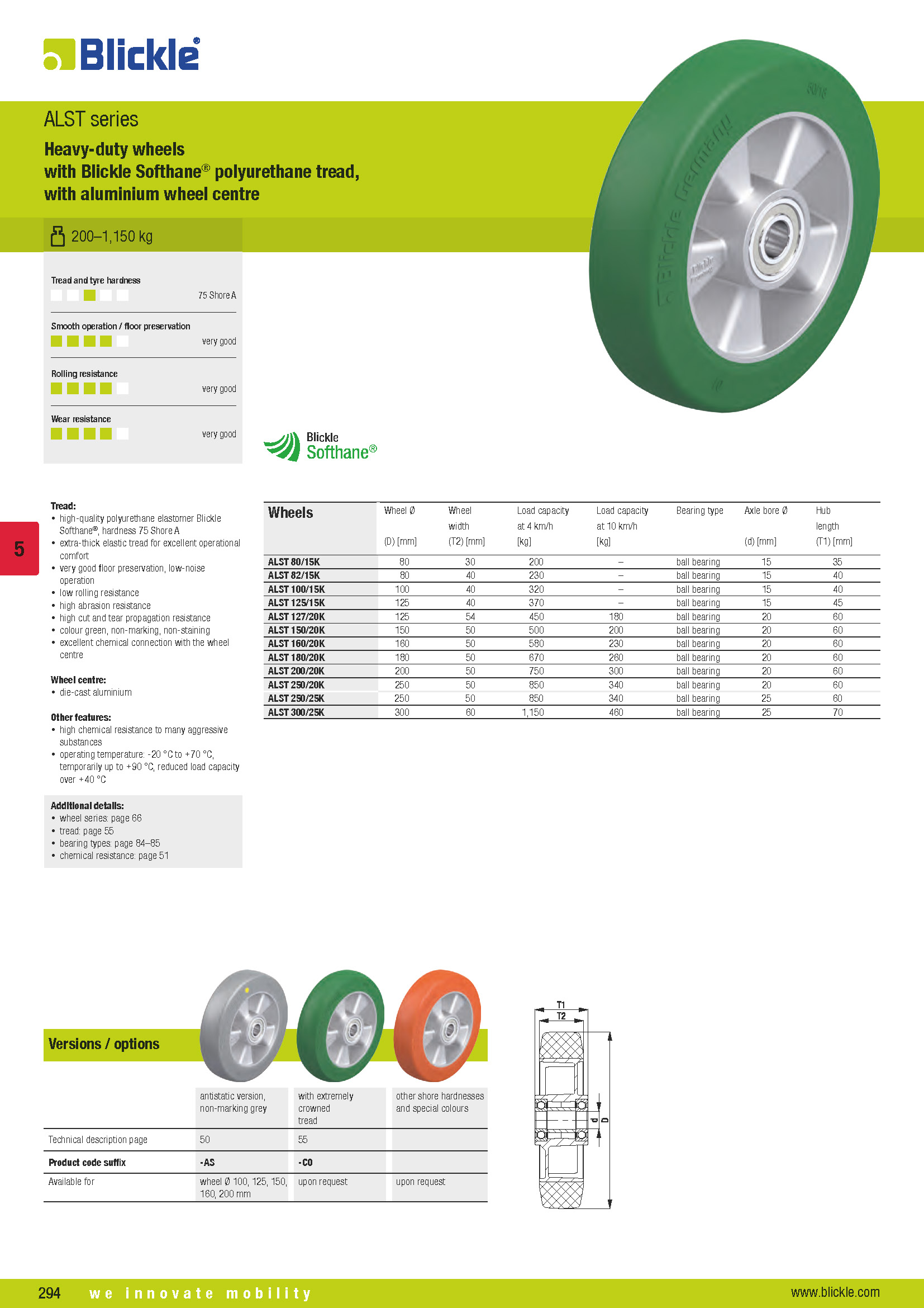 ALST Heavy-duty wheels with Blickle Softhane® polyurethane tread, with aluminium wheel centre