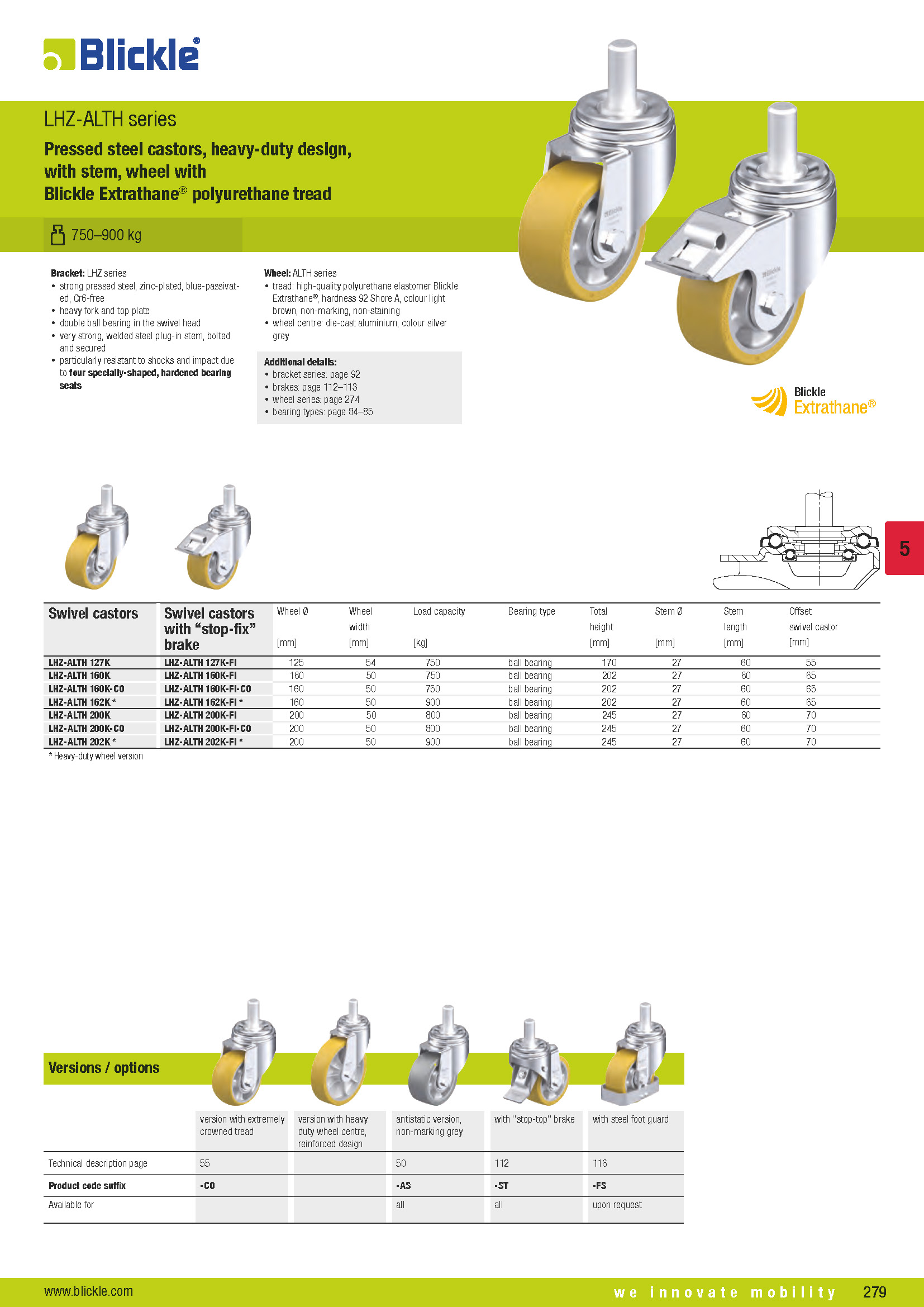 LHZ-ALTH Pressed steel castors, heavy-duty design, with stem, wheel with Blickle Extrathane® polyurethane tread
