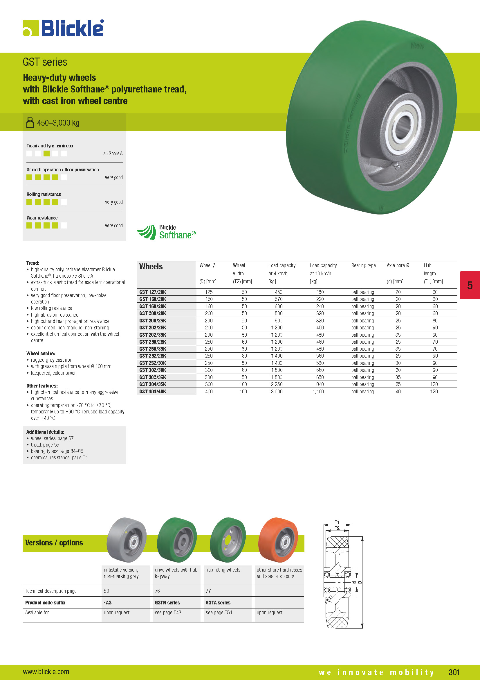 GST Heavy-duty wheels with Blickle Softhane® polyurethane tread, with cast iron wheel centre