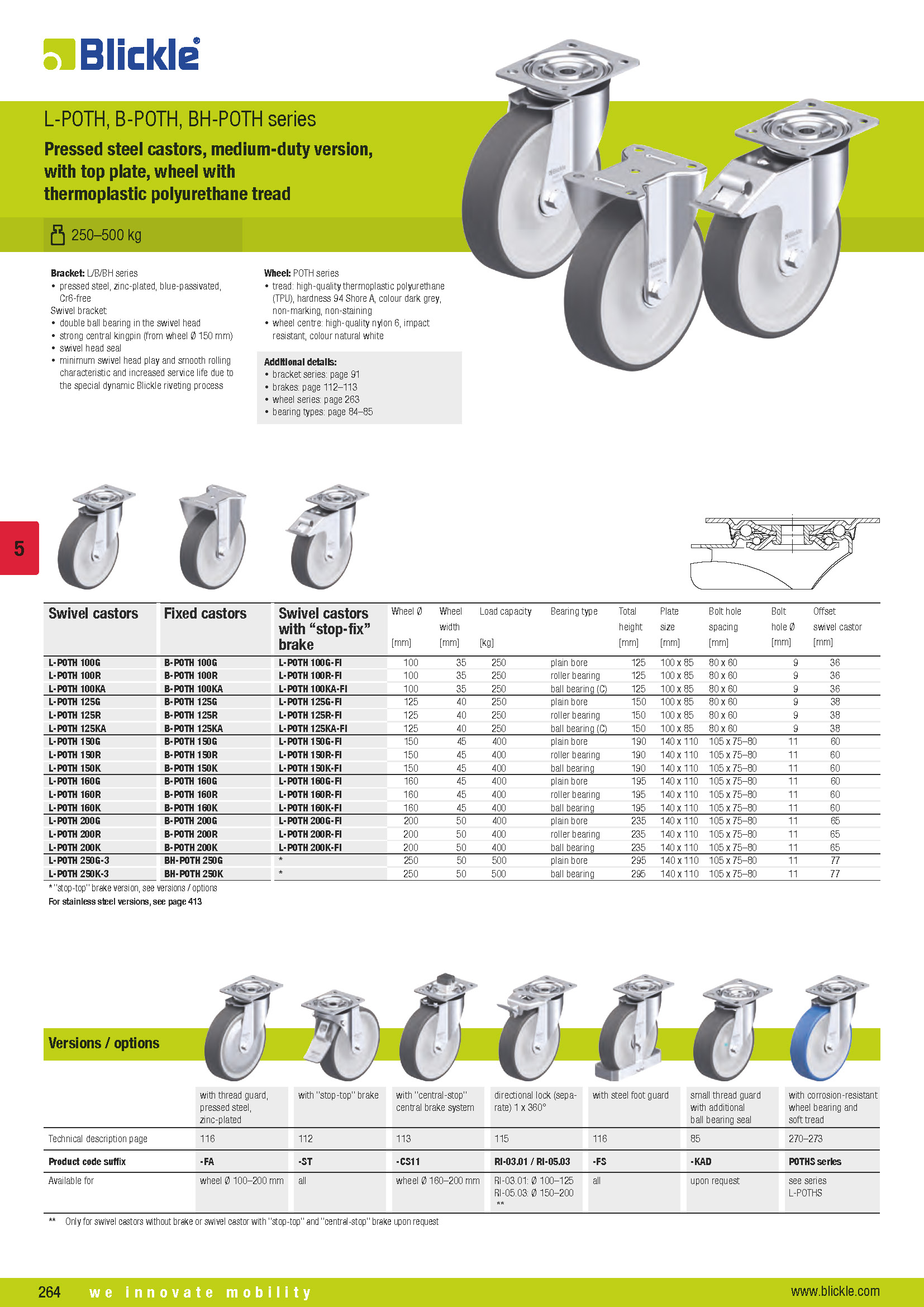 L-POTH, B-POTH, BH-POTH Stahlblech-Rollen, mittelschwere Ausführung, mit Anschraubplatte, Rad mit thermoplastischem Polyurethan-Laufbelag