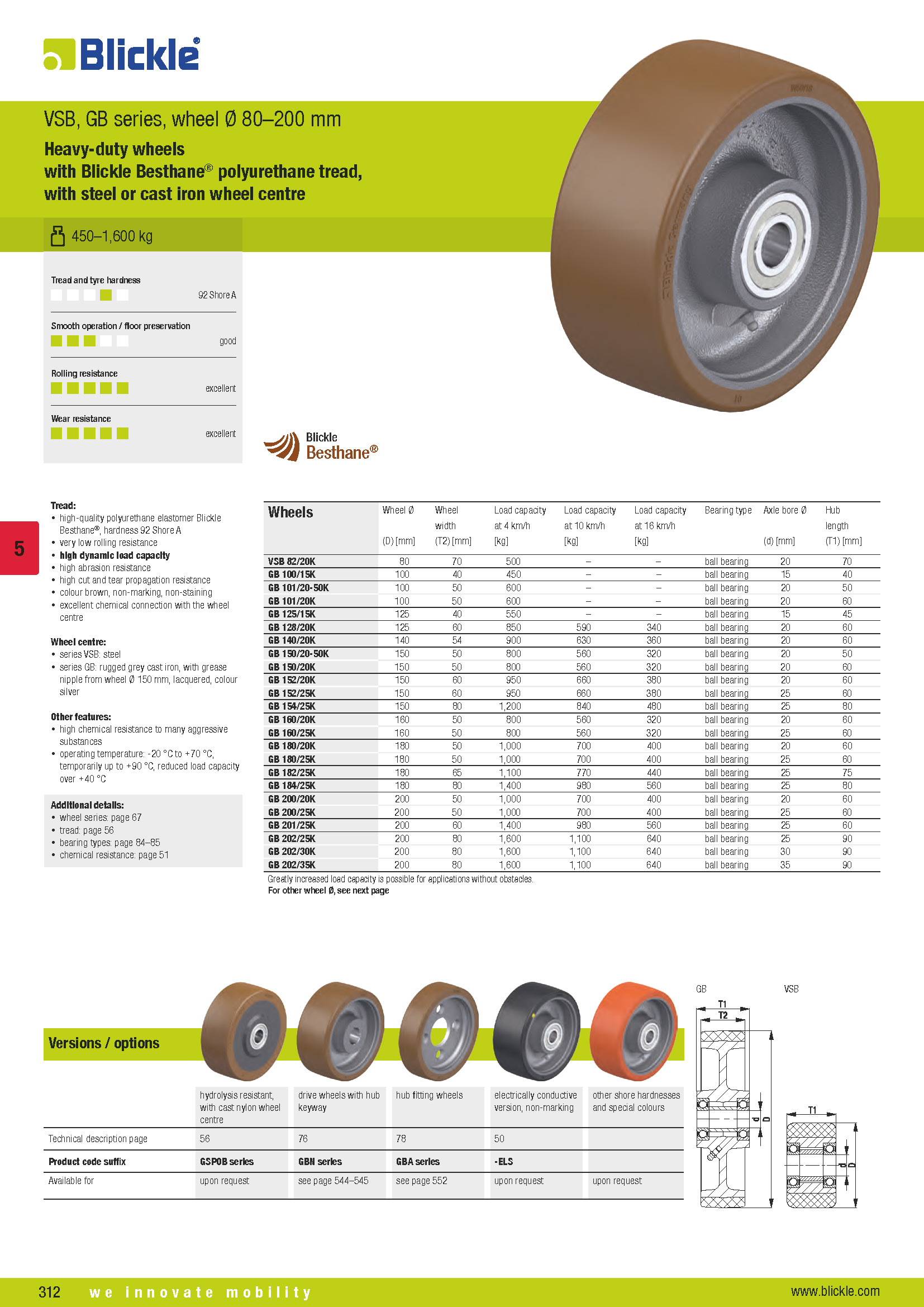 VSB, GB, wheel Ø 80–200 mm Heavy-duty wheels with Blickle Besthane® polyurethane tread, with steel or cast iron wheel centre
