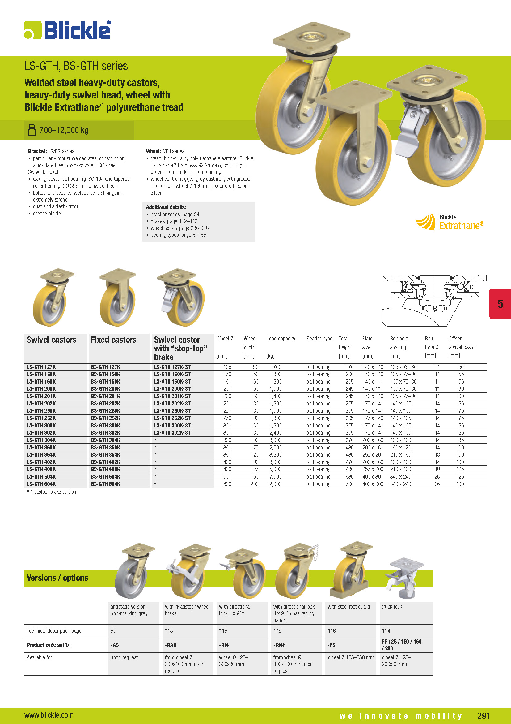 LS-GTH, BS-GTH Welded steel heavy-duty castors, heavy-duty swivel head, wheel with Blickle Extrathane® polyurethane tread
