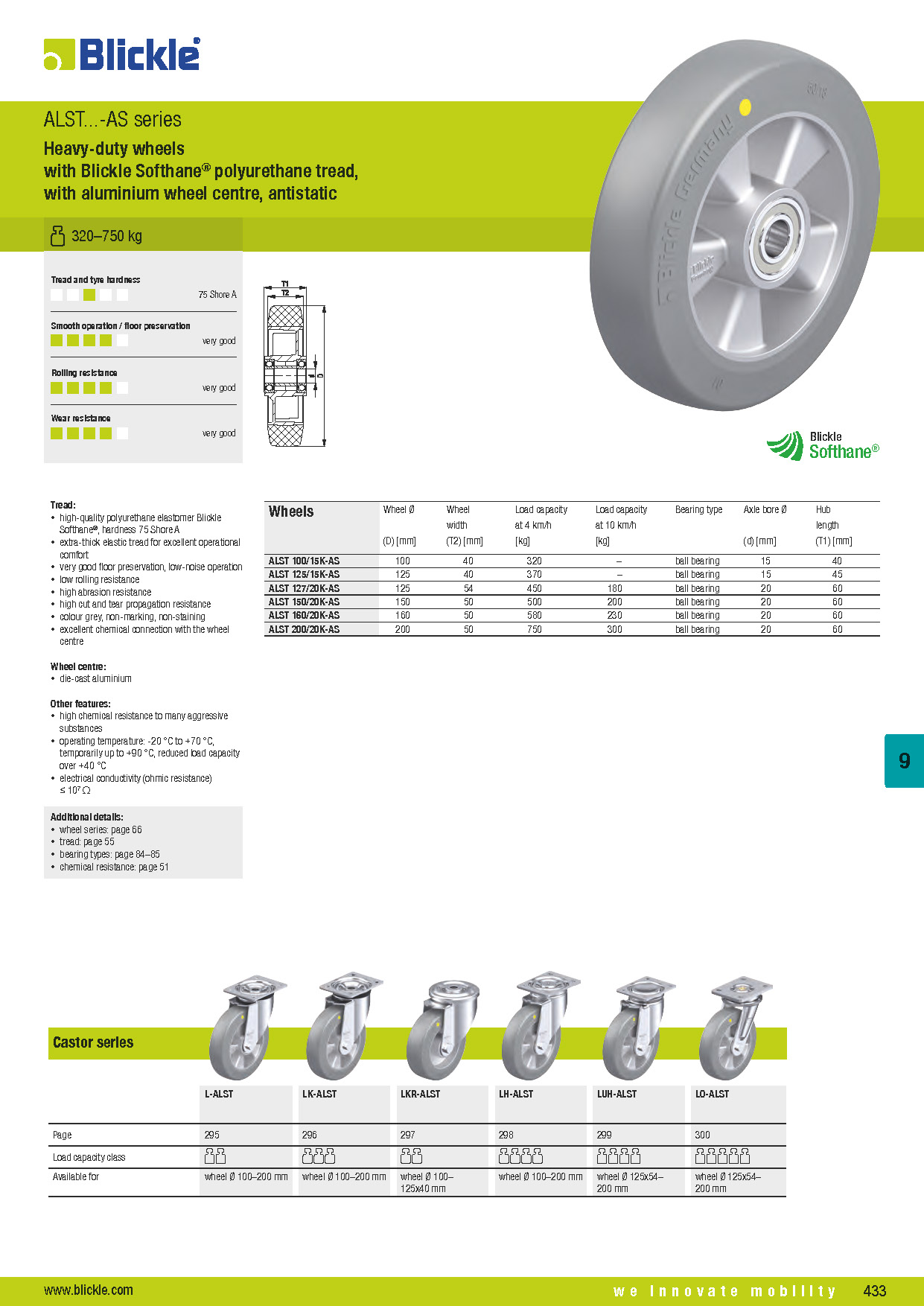 ALST-AS Heavy-duty wheels with Blickle Softhane® polyurethane tread, with aluminium wheel centre, antistatic