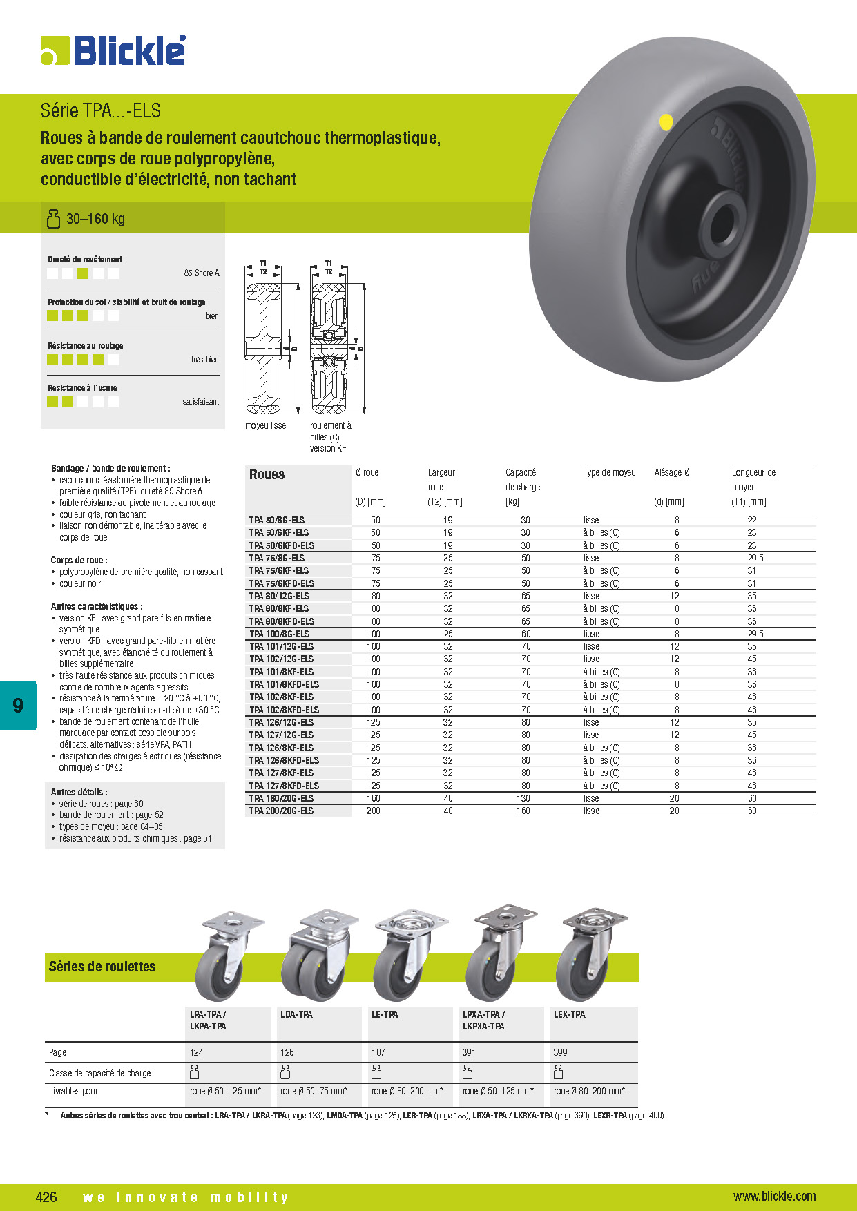 TPA-ELS Roues à bande de roulement caoutchouc thermoplastique, avec corps de roue polypropylène, conductible d’électricité, non tachant