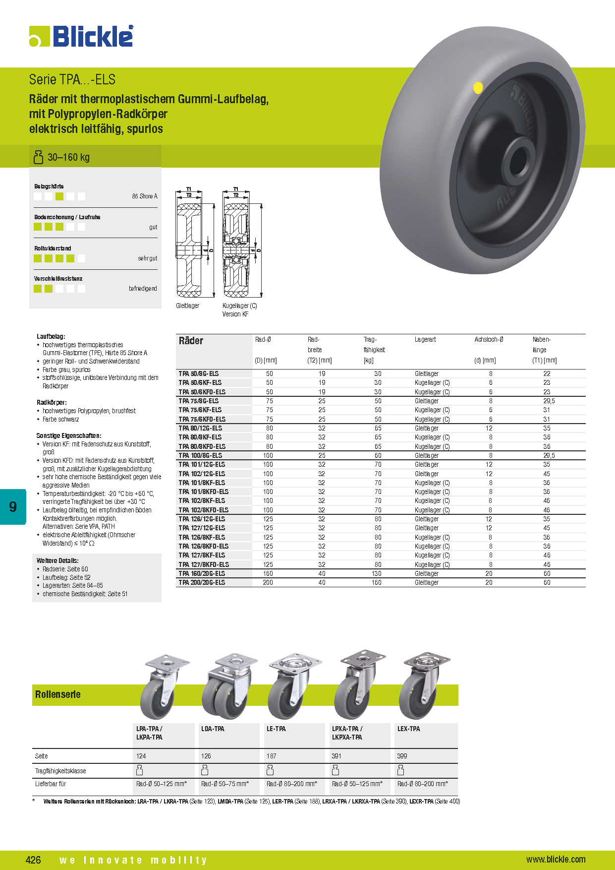 TPA-ELS Räder mit thermoplastischem Gummi-Laufbelag, mit Polypropylen-Radkörper elektrisch leitfähig, spurlos