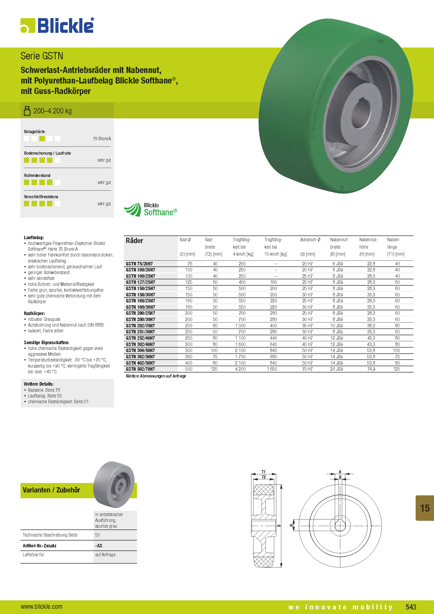 GSTN Schwerlast-Antriebsräder mit Nabennut, mit Polyurethan-Laufbelag Blickle Softhane®, mit Guss-Radkörper
