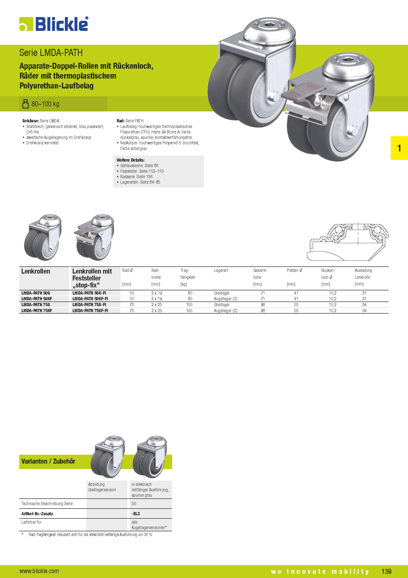LMDA-PATH Twin wheel light duty castors with bolt hole, wheel with thermoplastic polyurethane tread
