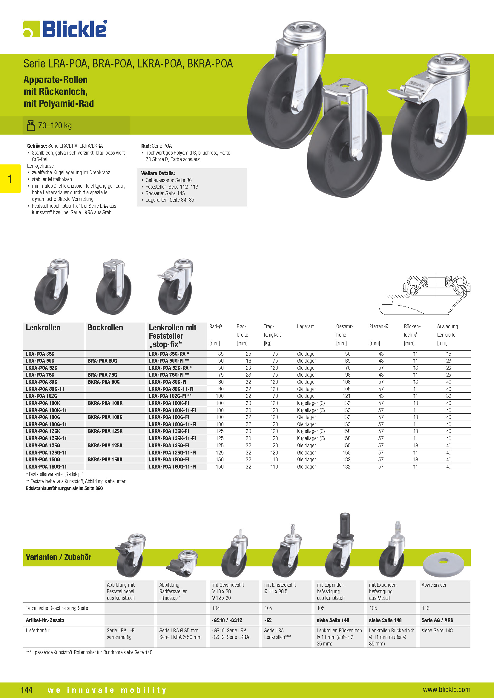LRA-POA, BRA-POA, LKRA-POA, BKRA-POA Apparate-Rollen mit Rückenloch, mit Polyamid-Rad