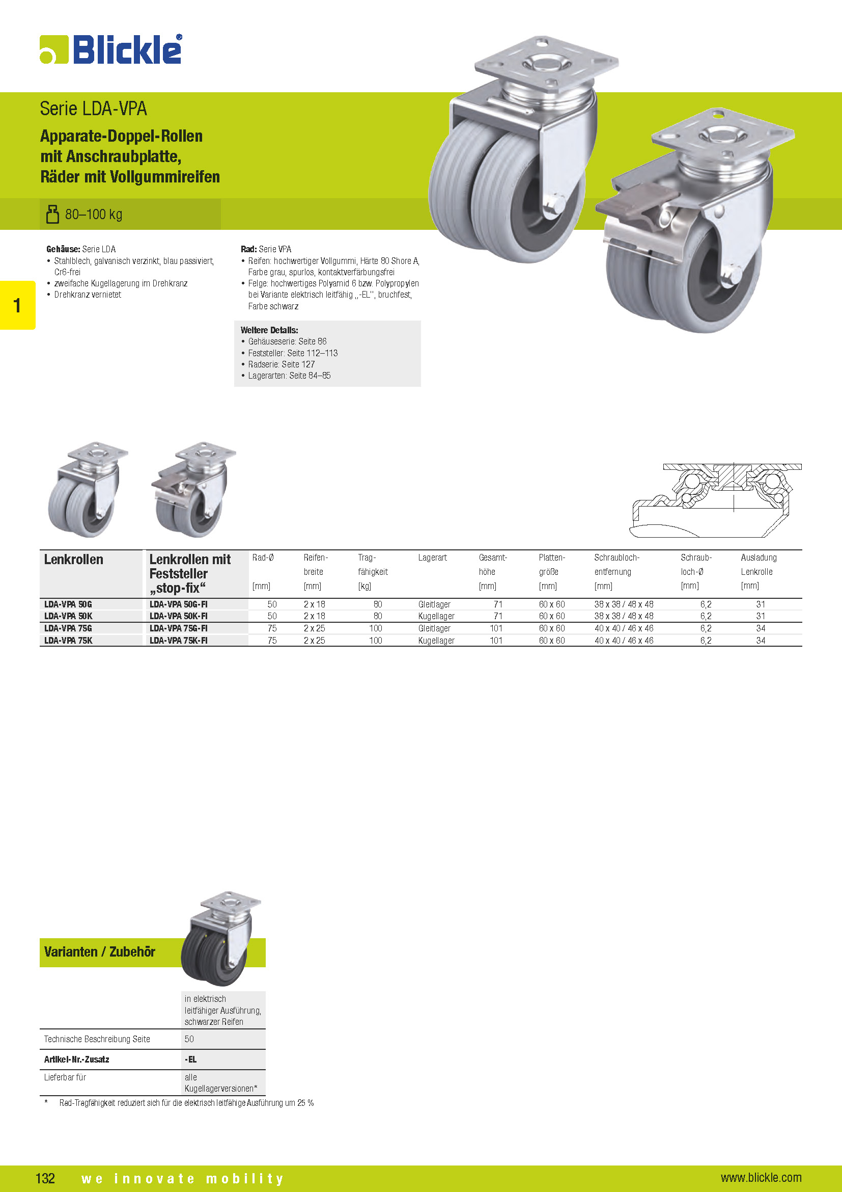 Lenkrollen mit Feststeller „stop-fix“ mit Gleitlager G