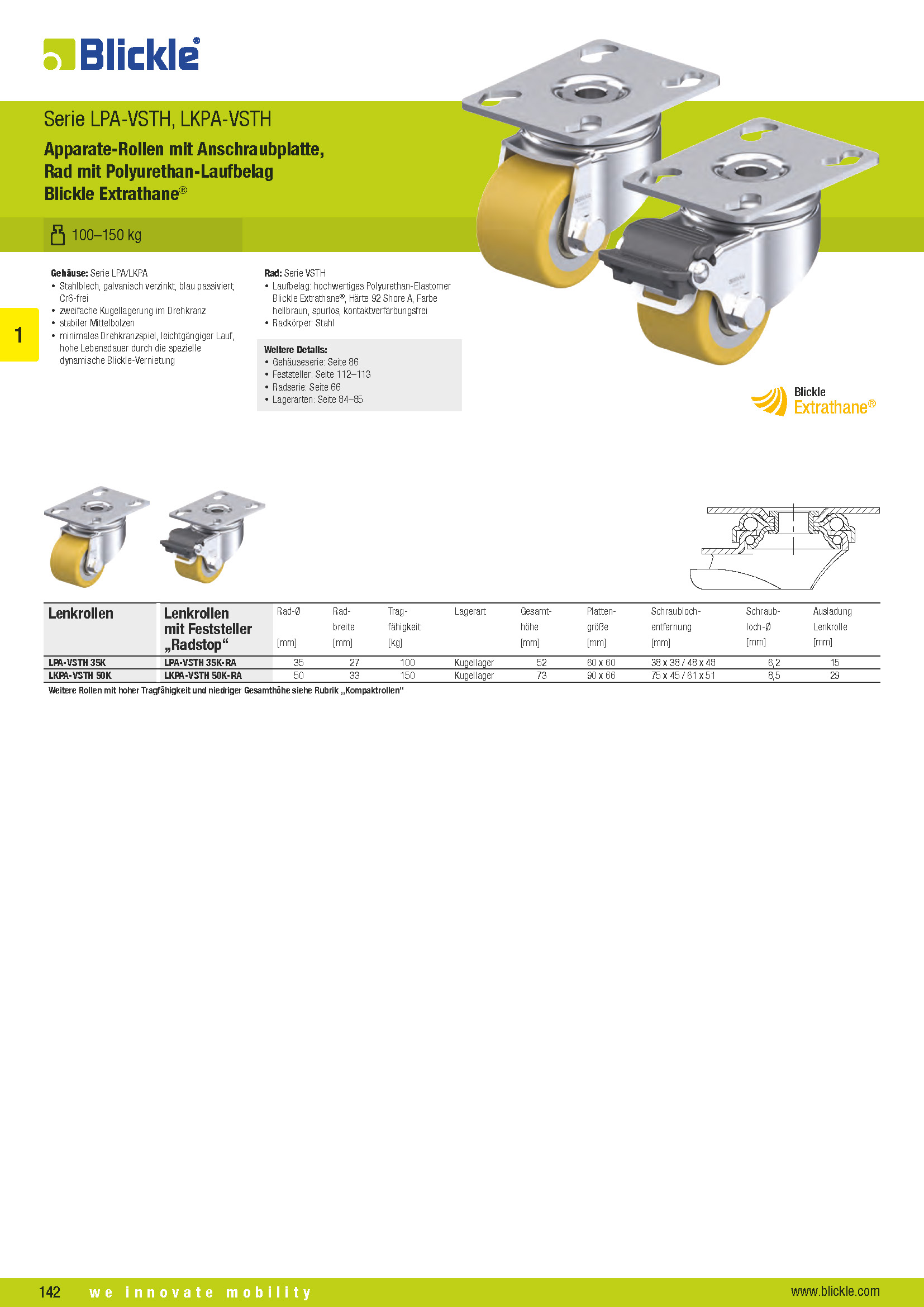 LPA-VSTH, LKPA-VSTH Apparate-Rollen mit Anschraubplatte, Rad mit Polyurethan-Laufbelag Blickle Extrathane®