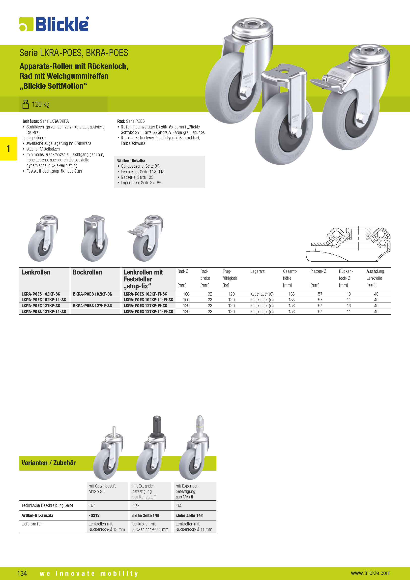 LKRA-POES, BKRA-POES Apparate-Rollen mit Rückenloch, Rad mit Weichgummireifen „Blickle SoftMotion“