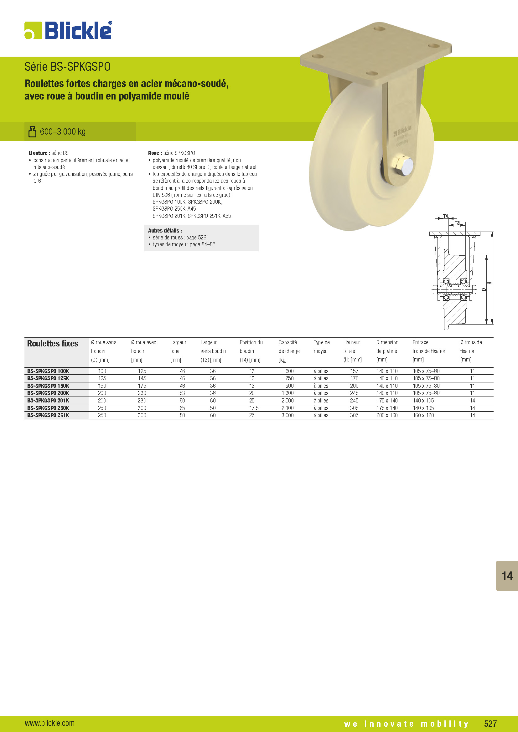 BS-SPKGSPO Roulettes fortes charges en acier mécano-soudé, avec roue à boudin en polyamide moulé