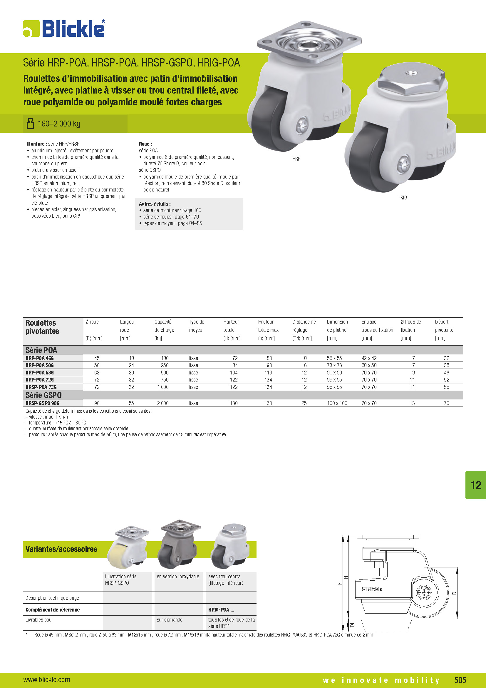 HRP-POA, HRSP-POA, HRSP-GSPO, HRIG-POA Roulettes d’immobilisation avec patin d’immobilisation intégré, avec platine à visser ou trou central fileté, avec roue polyamide ou polyamide moulé fortes charges