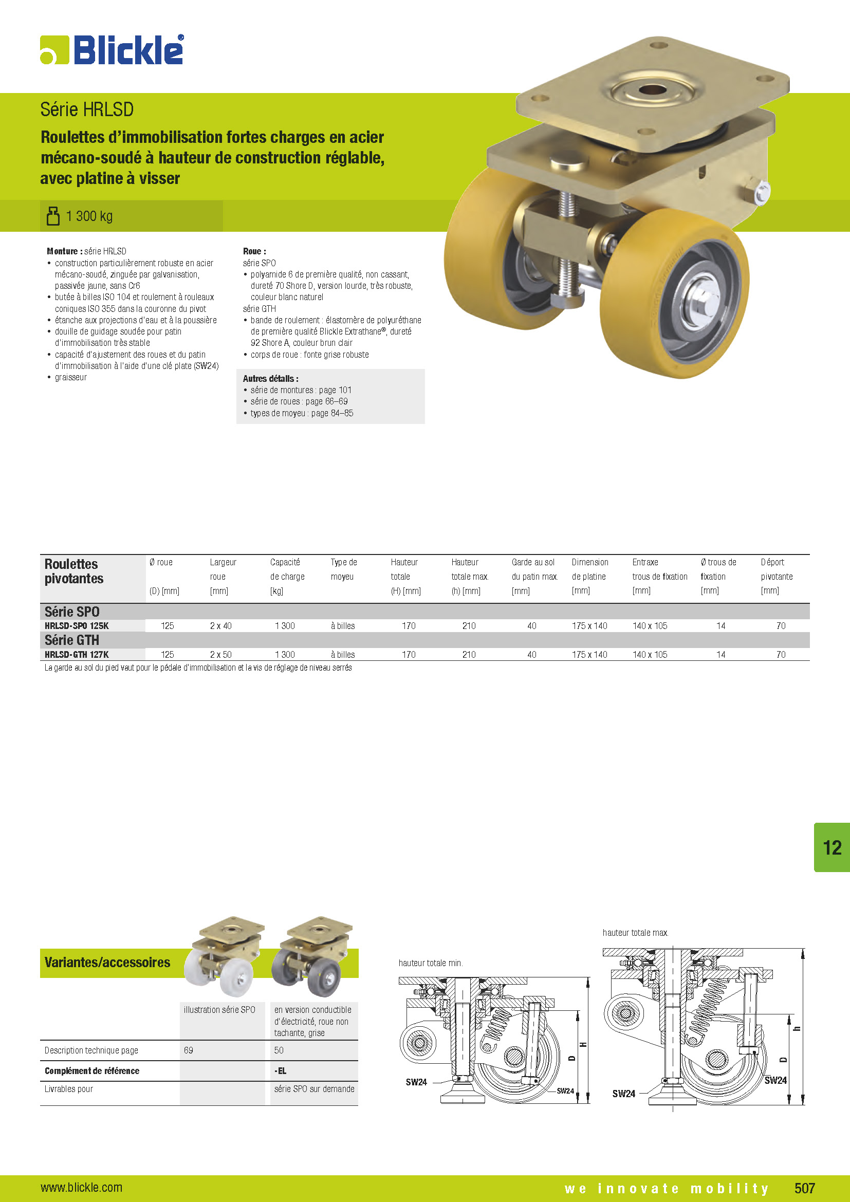 HRLSD Roulettes d’immobilisation fortes charges en acier mécano-soudé à hauteur de construction réglable, avec platine à visser