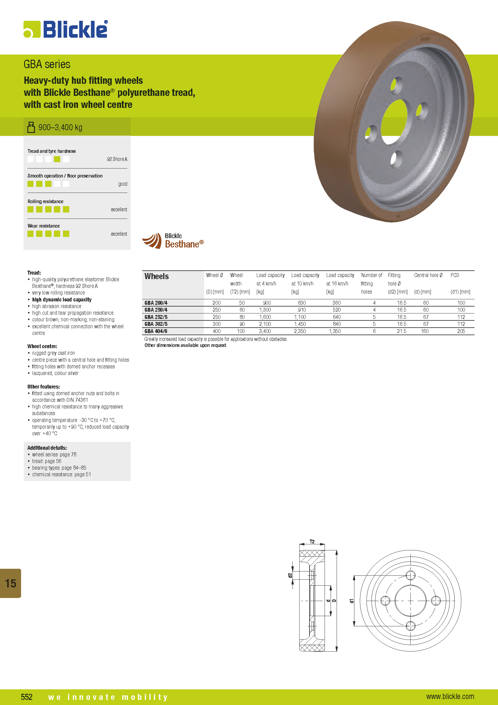 GBA Heavy-duty hub fitting wheels with Blickle Besthane® polyurethane tread, with cast iron wheel centre