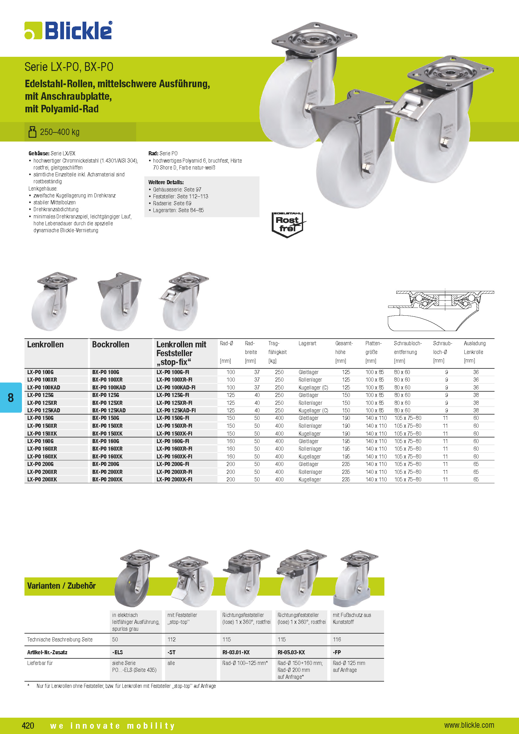 LX-PO, BX-PO Edelstahl-Rollen, mittelschwere Ausführung, mit Anschraubplatte, mit Polyamid-Rad