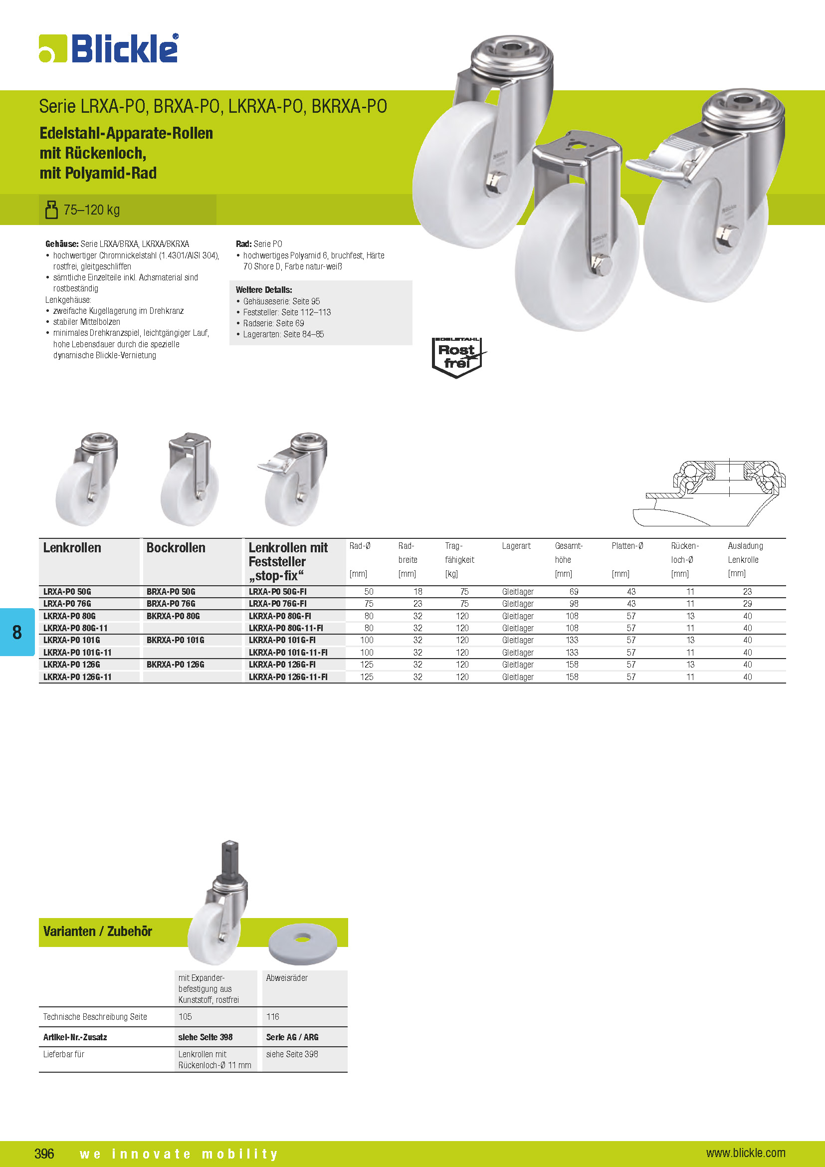 LRXA-PO, BRXA-PO, LKRXA-PO, BKRXA-PO Edelstahl-Apparate-Rollen mit Rückenloch, mit Polyamid-Rad