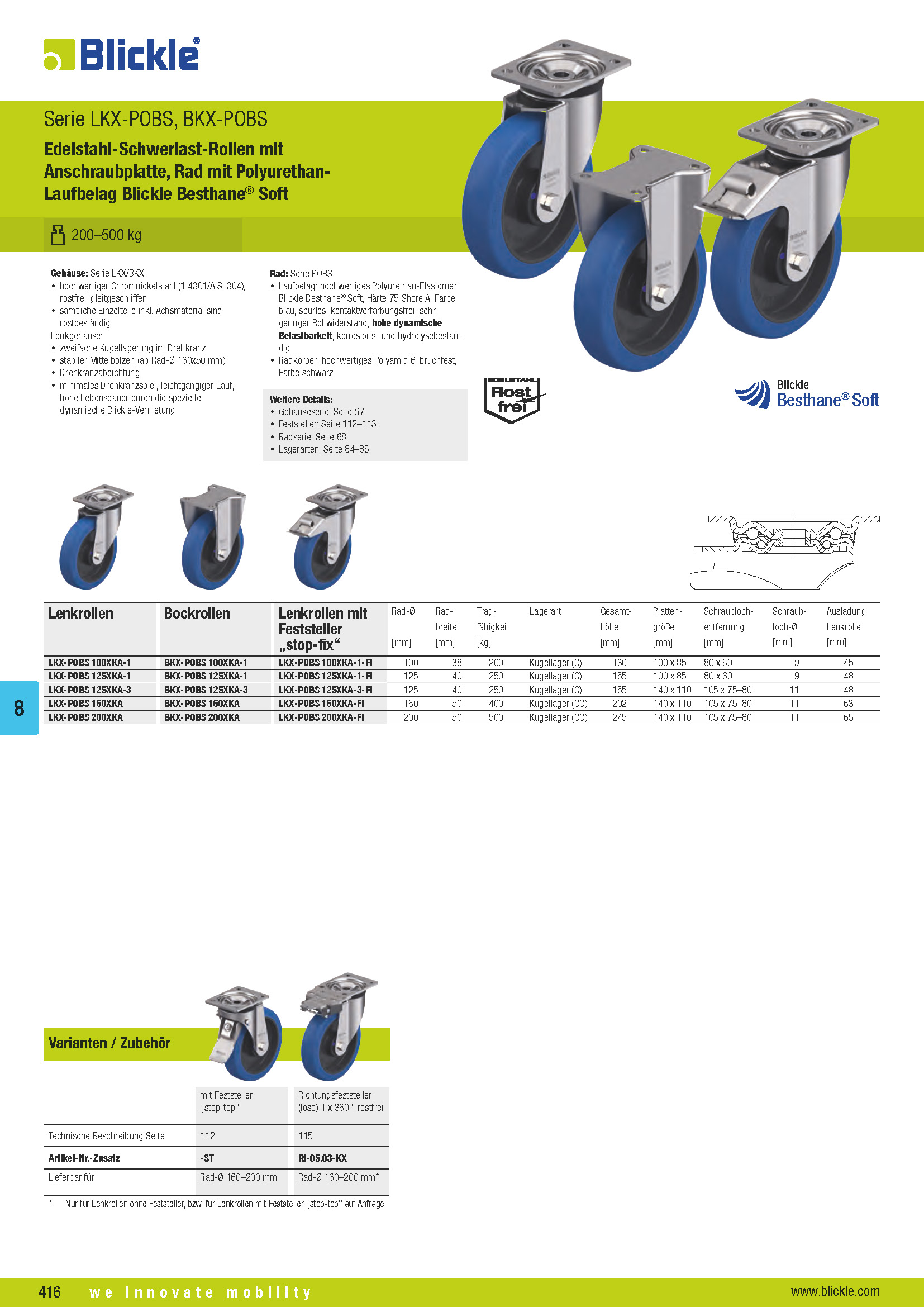 LKX-POBS, BKX-POBS Edelstahl-Schwerlast-Rollen mit Anschraubplatte, Rad mit Polyurethan- Laufbelag Blickle Besthane® Soft