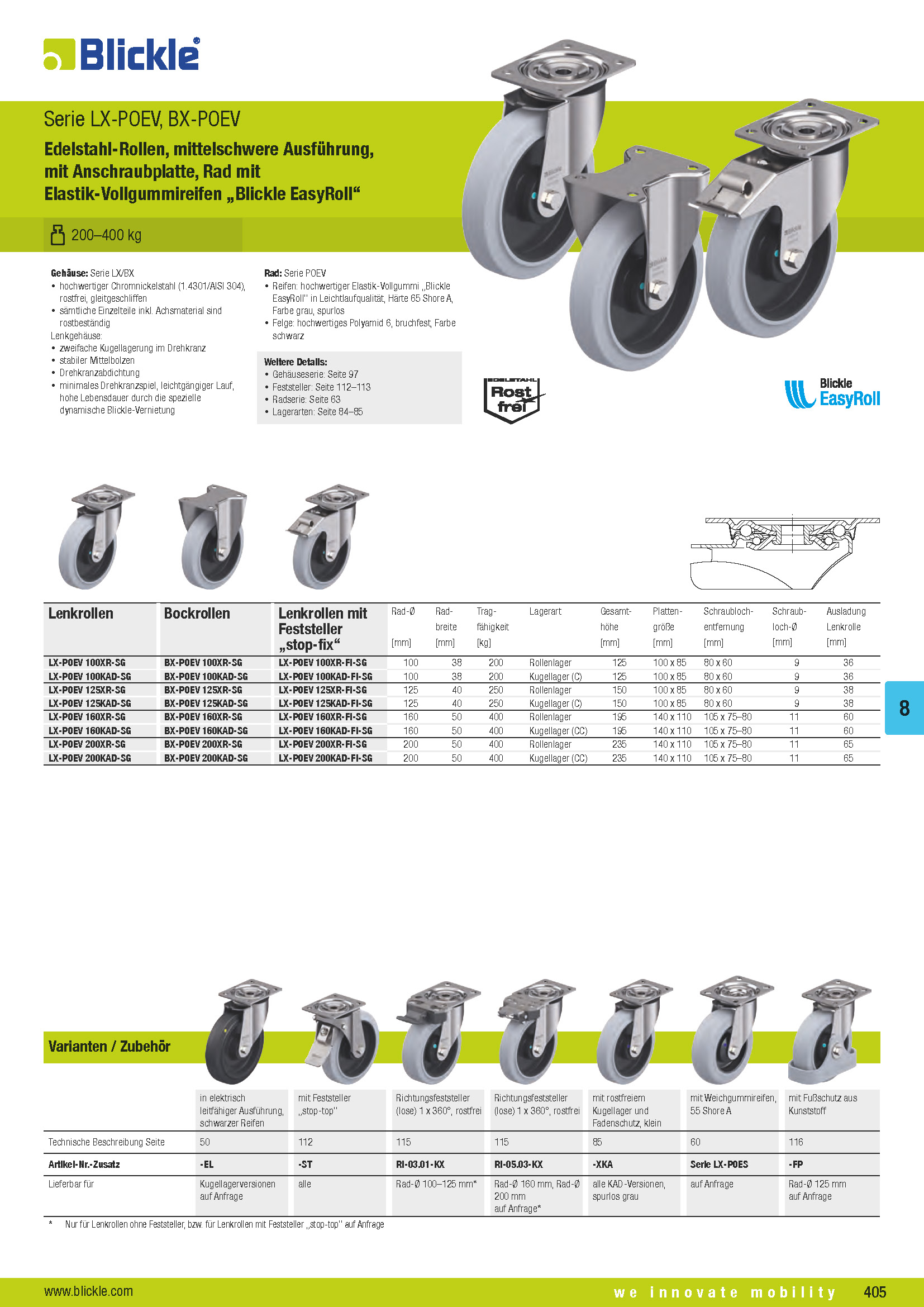LX-POEV, BX-POEV Edelstahl-Rollen, mittelschwere Ausführung, mit Anschraubplatte, Rad mit Elastik-Vollgummireifen „Blickle EasyRoll“