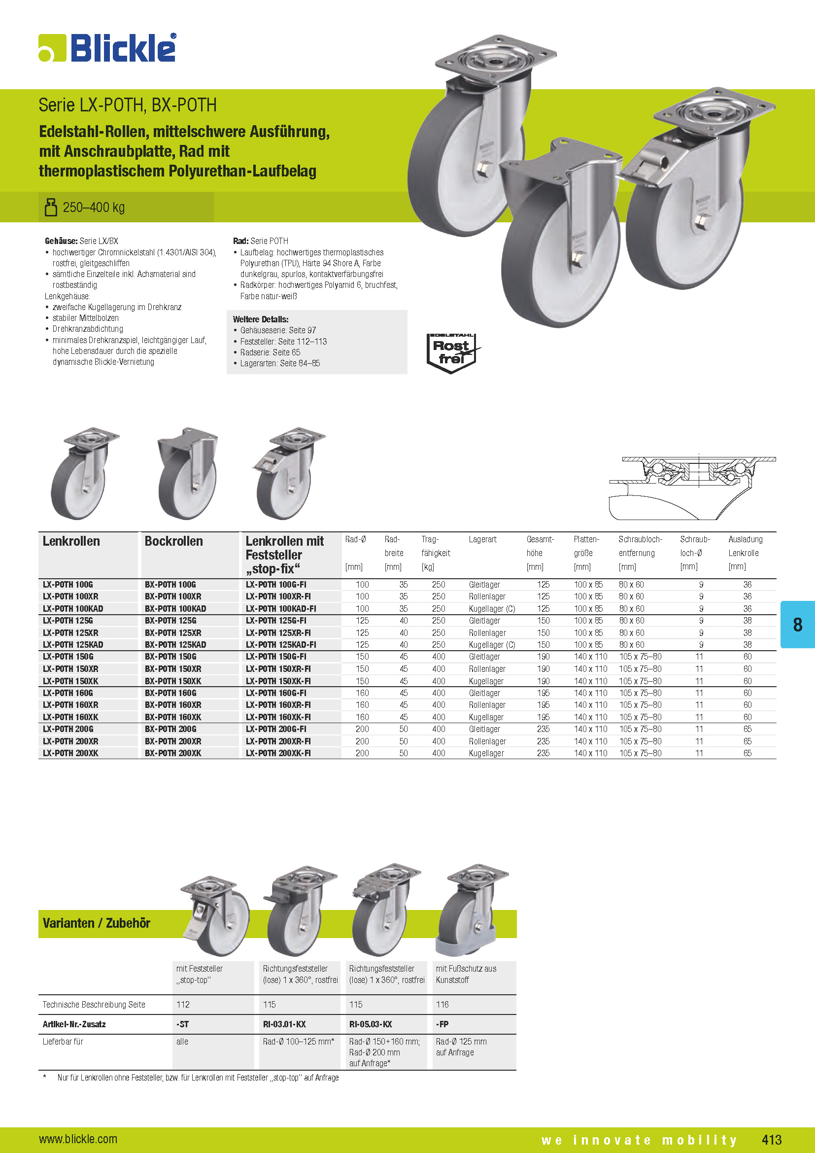 LX-POTH, BX-POTH Stainless steel castors, medium-duty design, with top plate, wheel with thermoplastic polyurethane tread