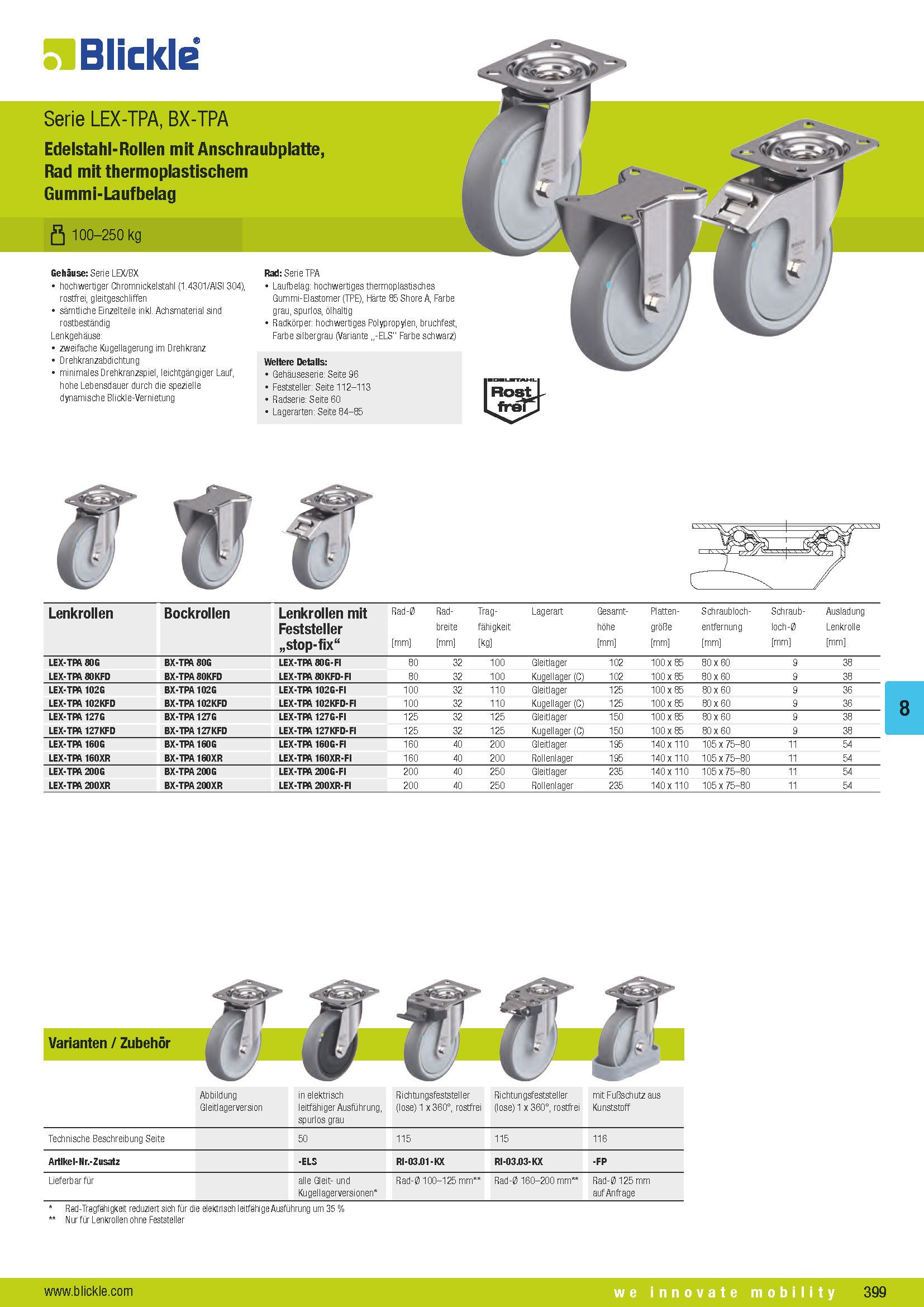 LEX-TPA, BX-TPA Edelstahl-Rollen mit Anschraubplatte, Rad mit thermoplastischem Gummi-Laufbelag