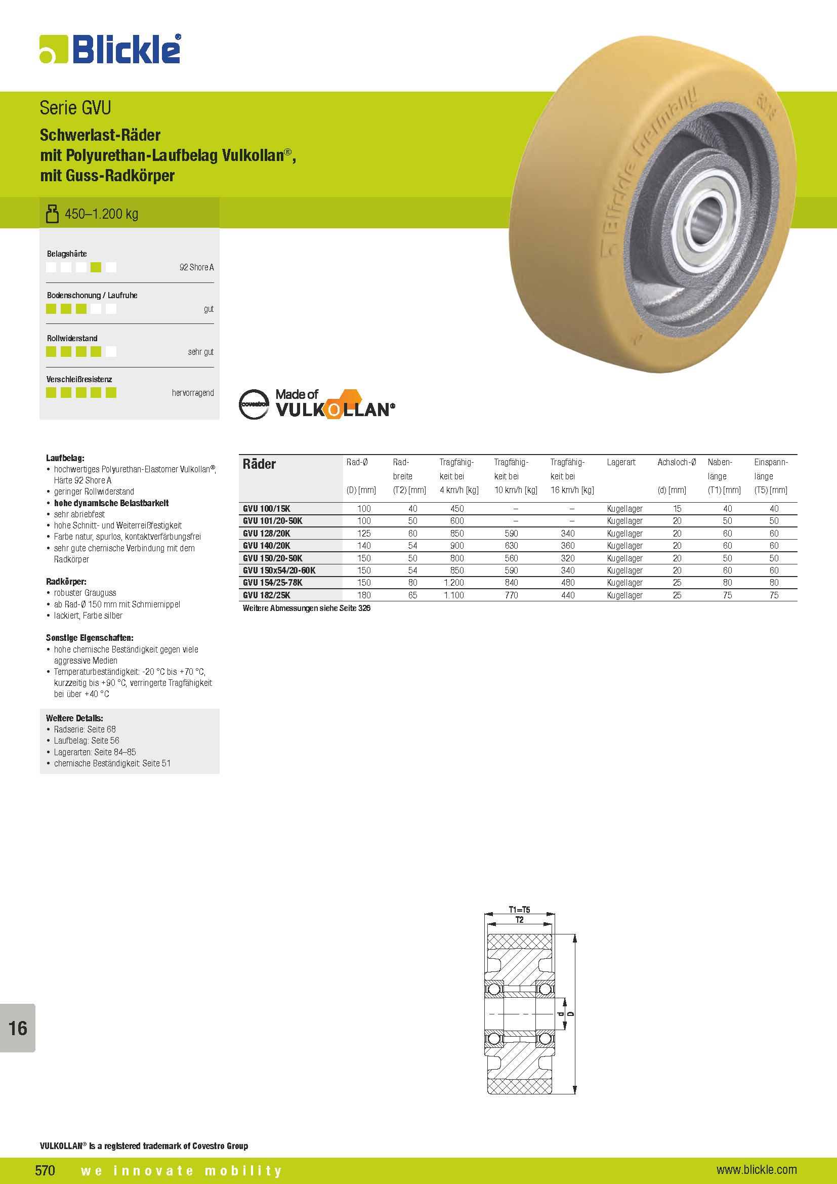 GVU Schwerlast-Räder mit Polyurethan-Laufbelag Vulkollan®, mit Guss-Radkörper
