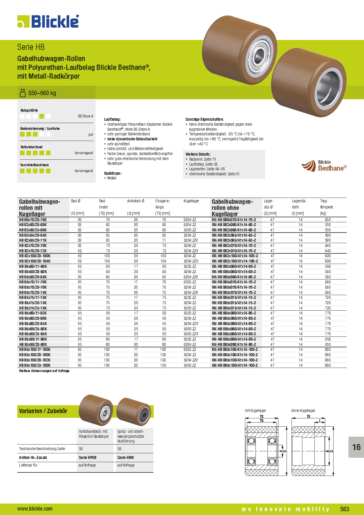 HB Gabelhubwagen-Rollen mit Polyurethan-Laufbelag Blickle Besthane®, mit Metall-Radkörper