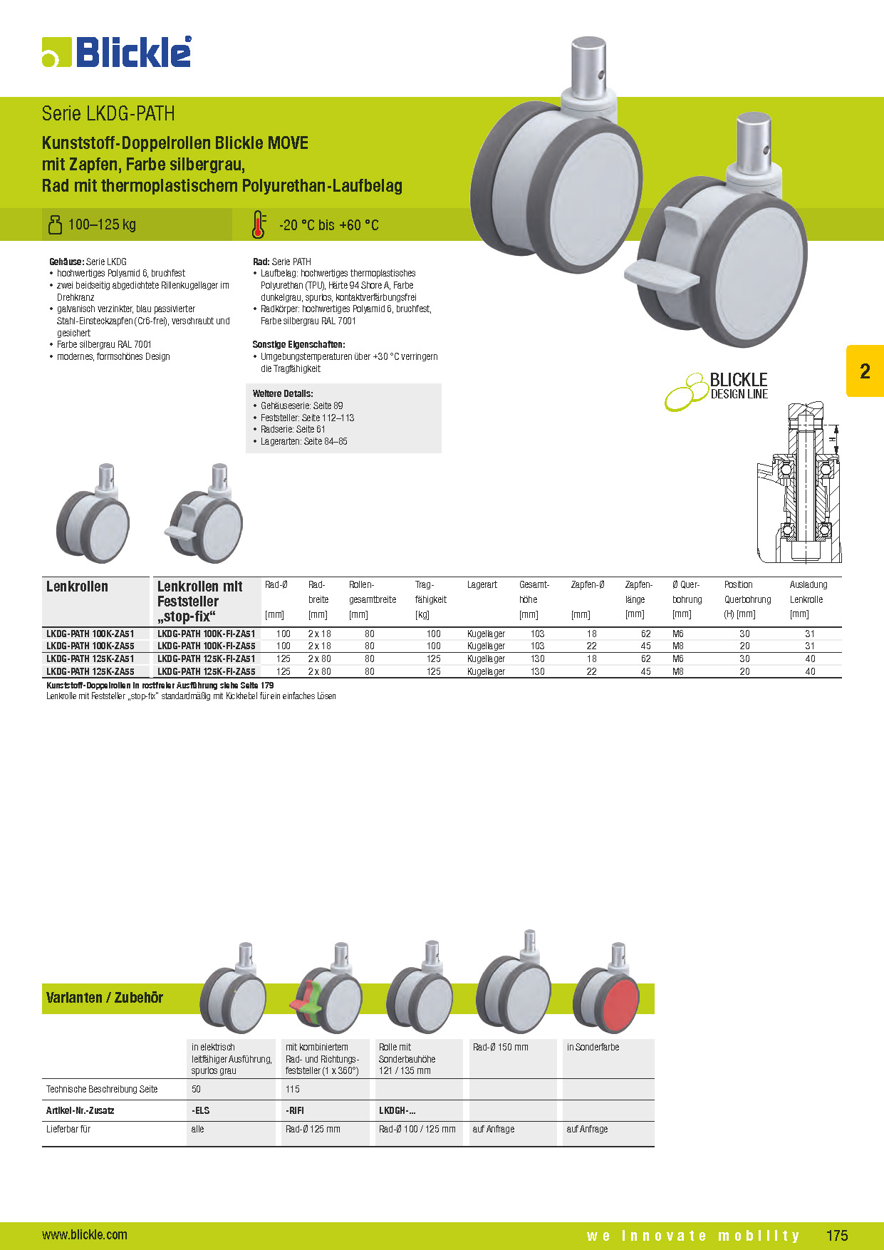 LKDG-PATH Kunststoff-Doppelrollen Blickle MOVE mit Zapfen, Farbe silbergrau, Rad mit thermoplastischem Polyurethan-Laufbelag