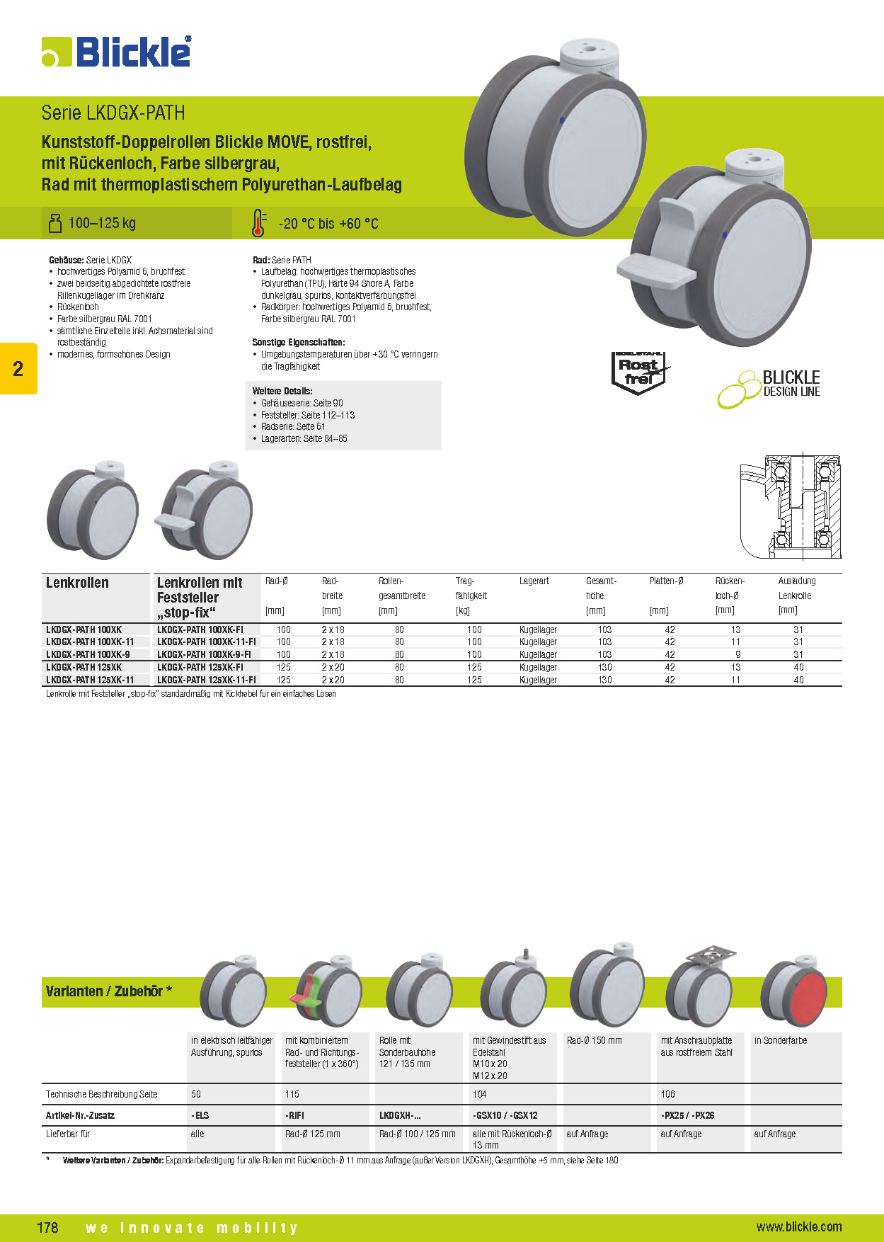 LKDGX-PATH Kunststoff-Doppelrollen Blickle MOVE, rostfrei, mit Rückenloch, Farbe silbergrau, Rad mit thermoplastischem Polyurethan-Laufbelag
