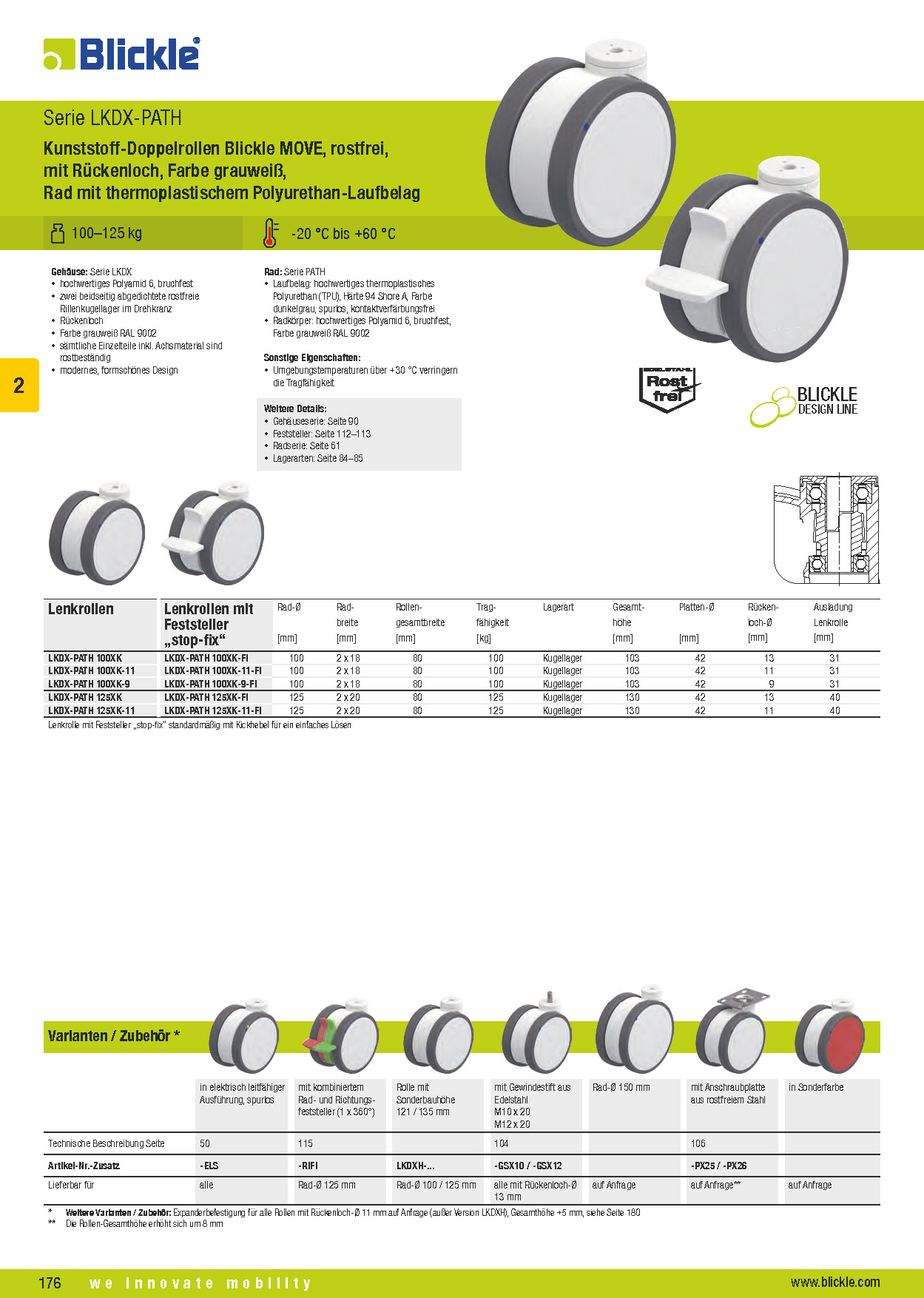 LKDX-PATH Kunststoff-Doppelrollen Blickle MOVE, rostfrei, mit Rückenloch, Farbe grauweiß, Rad mit thermoplastischem Polyurethan-Laufbelag