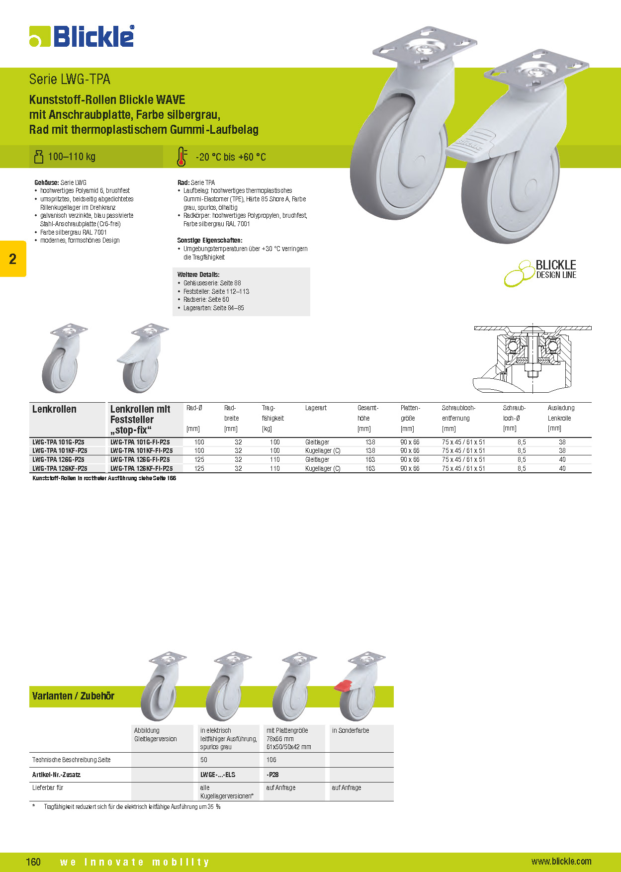 LWG-TPA Kunststoff-Rollen Blickle WAVE mit Anschraubplatte, Farbe silbergrau, Rad mit thermoplastischem Gummi-Laufbelag