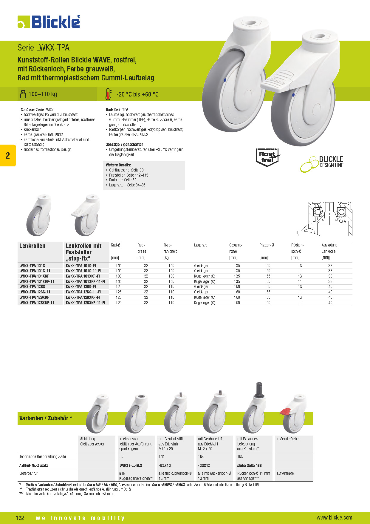 LWKX-TPA Kunststoff-Rollen Blickle WAVE, rostfrei, mit Rückenloch, Farbe grauweiß, Rad mit thermoplastischem Gummi-Laufbelag