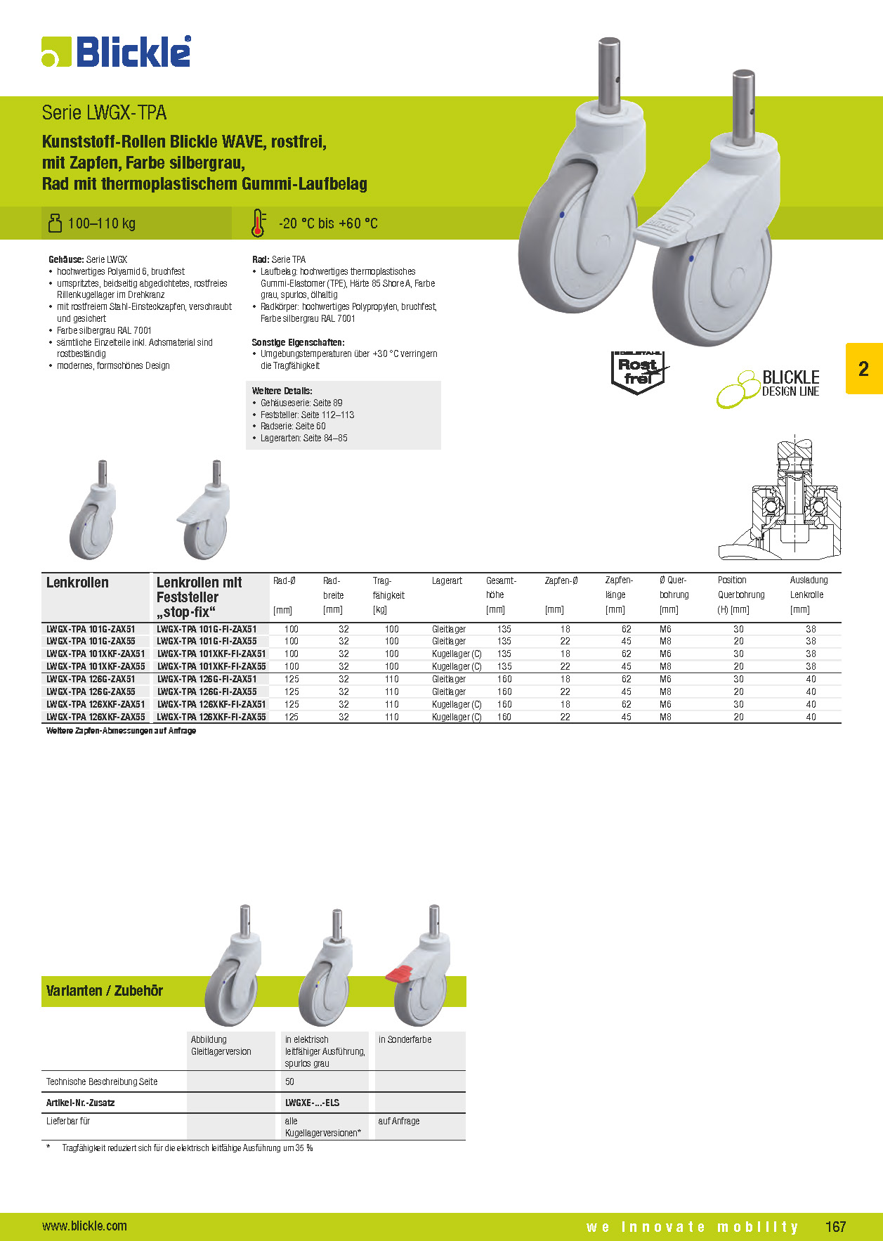 LWGX-TPA Kunststoff-Rollen Blickle WAVE, rostfrei, mit Zapfen, Farbe silbergrau, Rad mit thermoplastischem Gummi-Laufbelag