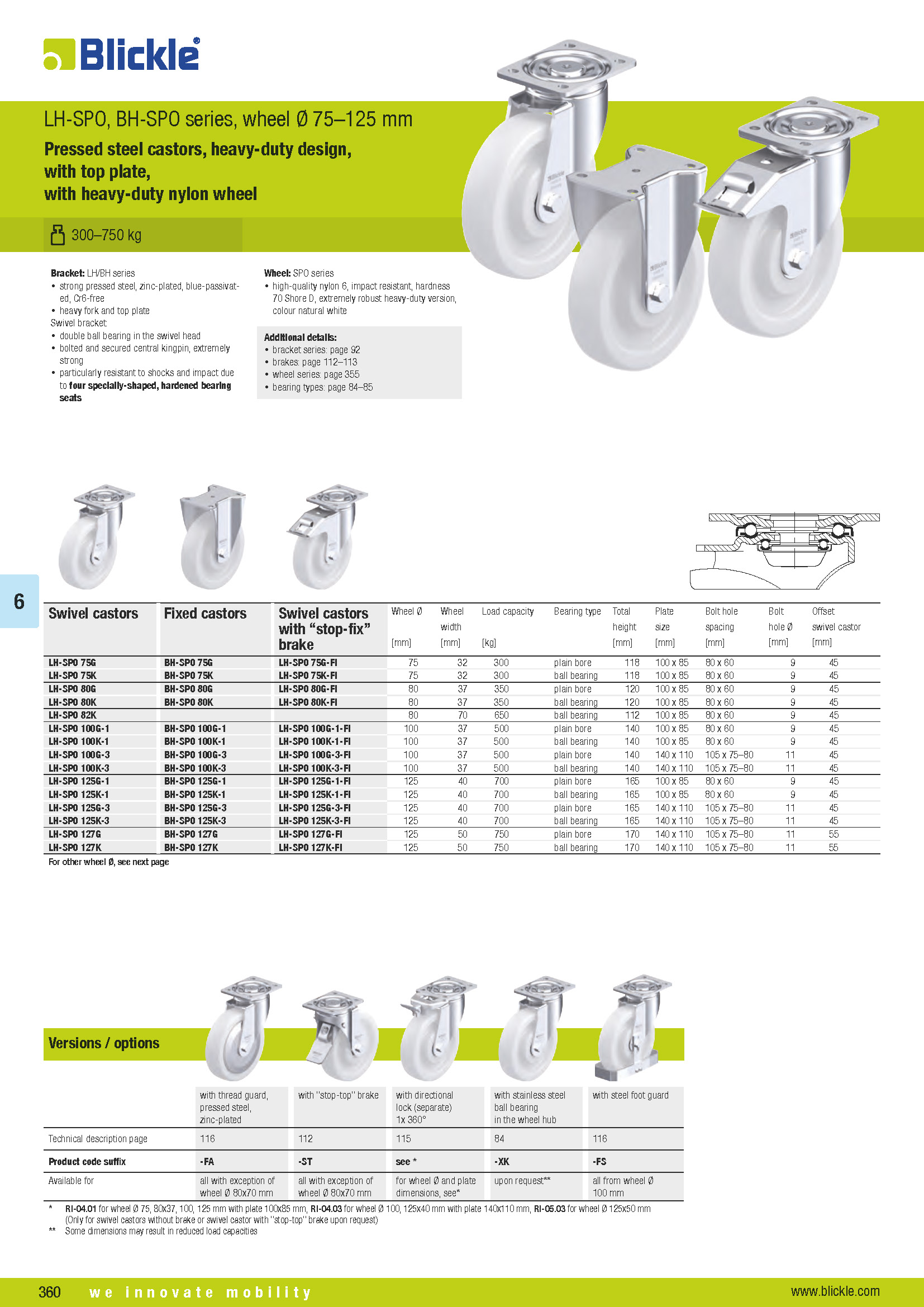 LH-SPO, BH-SPO, wheel Ø 75–125 mm Pressed steel castors, heavy-duty design, with top plate, with heavy-duty nylon wheel