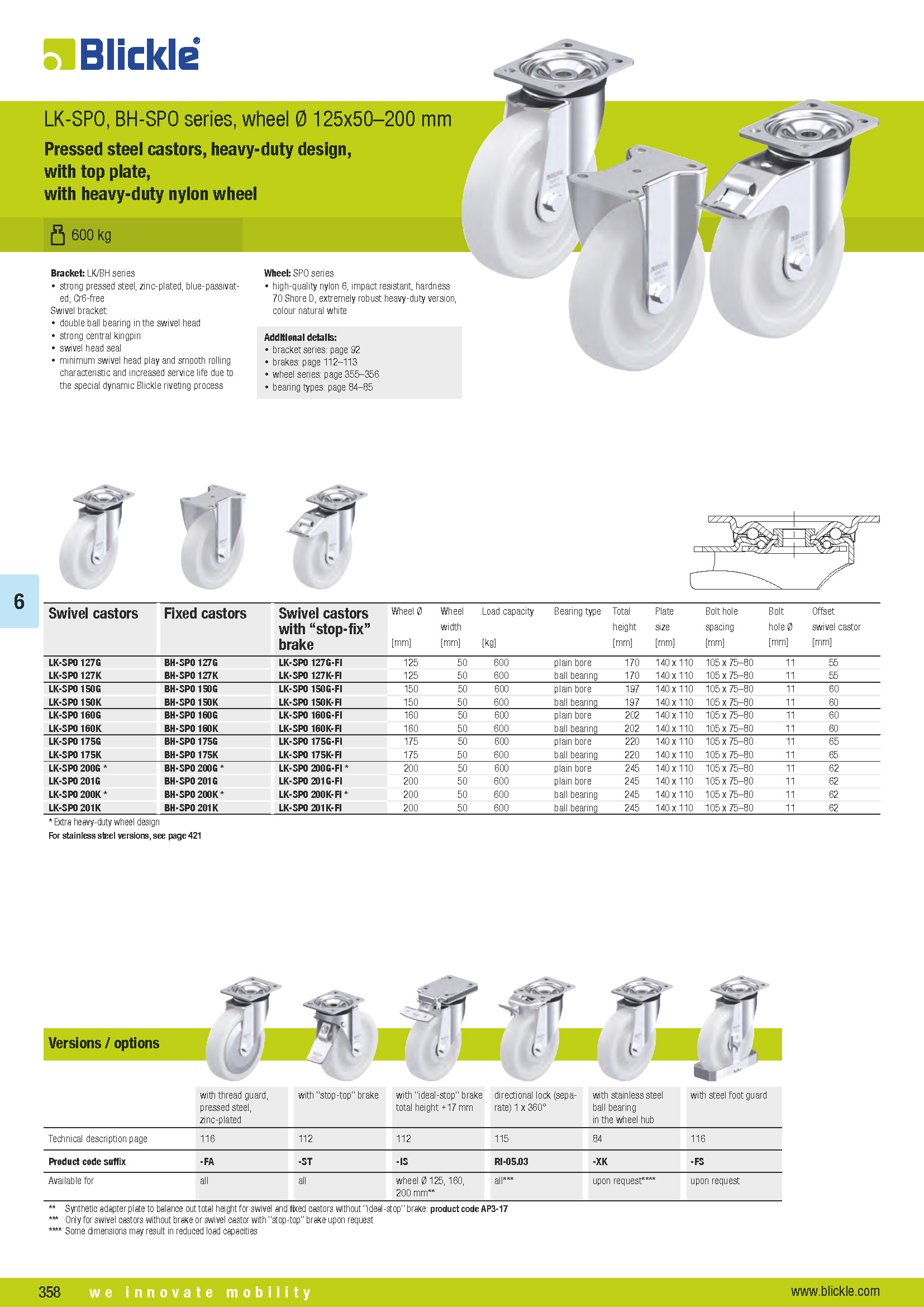 LK-SPO, BH-SPO, wheel Ø 125x50–200 mm Pressed steel castors, heavy-duty design, with top plate, with heavy-duty nylon wheel