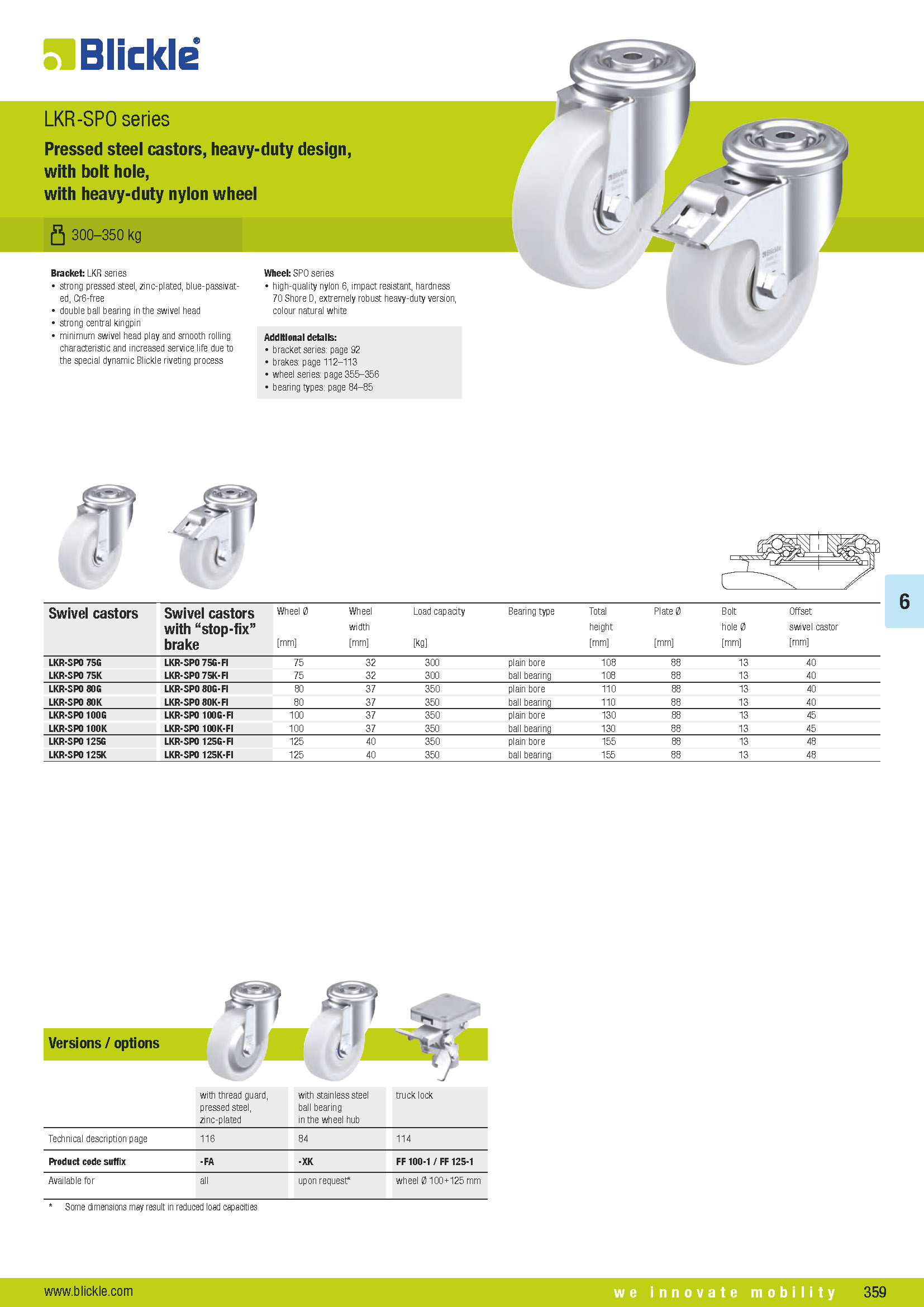 LKR-SPO Pressed steel castors, heavy-duty design, with bolt hole, with heavy-duty nylon wheel
