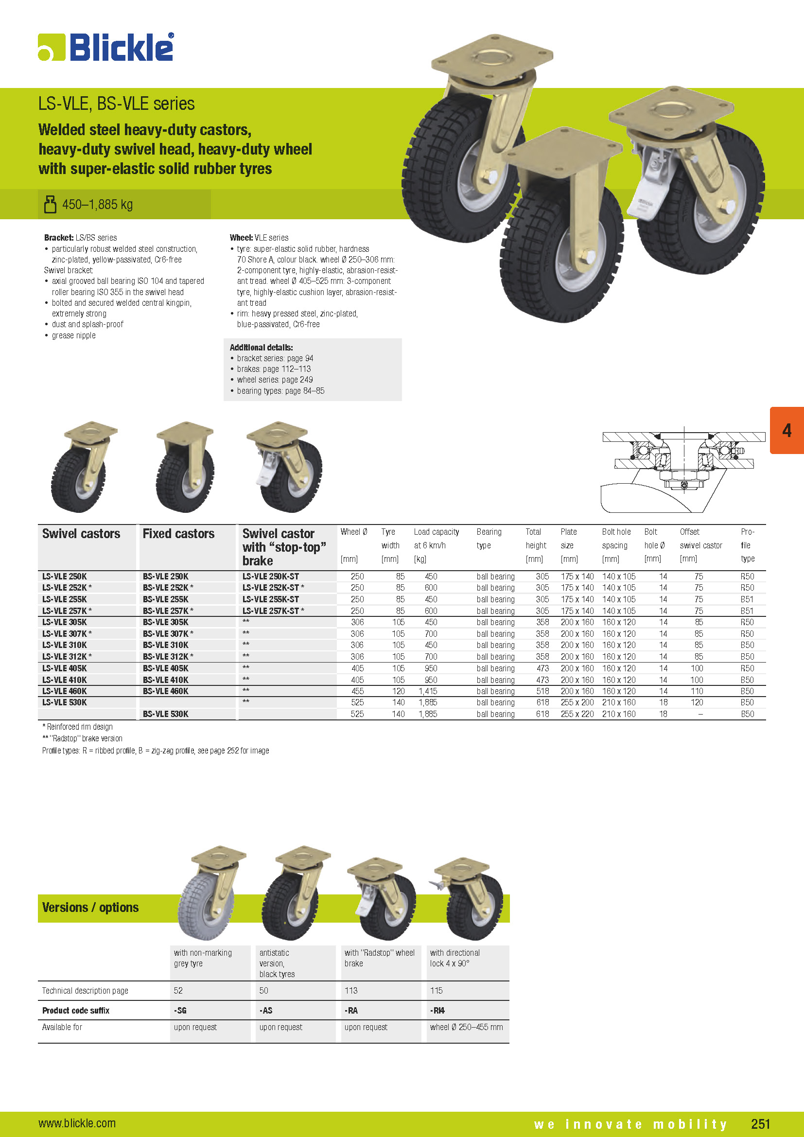 LS-VLE, BS-VLE Welded steel heavy-duty castors, heavy-duty swivel head, heavy-duty wheel with super-elastic solid rubber tyres