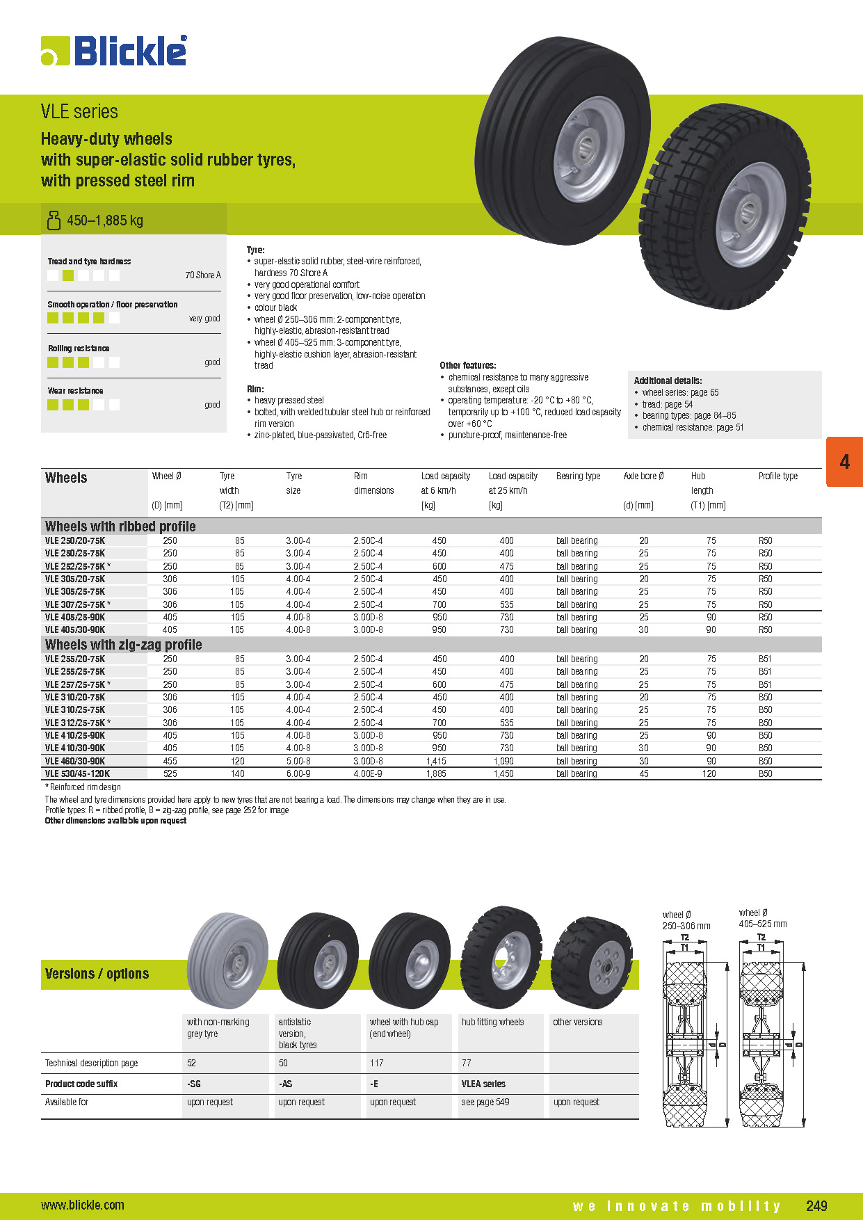 VLE Heavy-duty wheels with super-elastic solid rubber tyres, with pressed steel rim