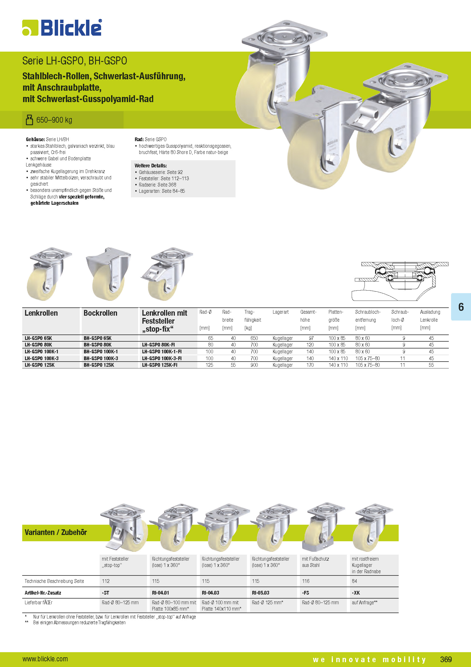LH-GSPO, BH-GSPO Stahlblech-Rollen, Schwerlast-Ausführung, mit Anschraubplatte, mit Schwerlast-Gusspolyamid-Rad