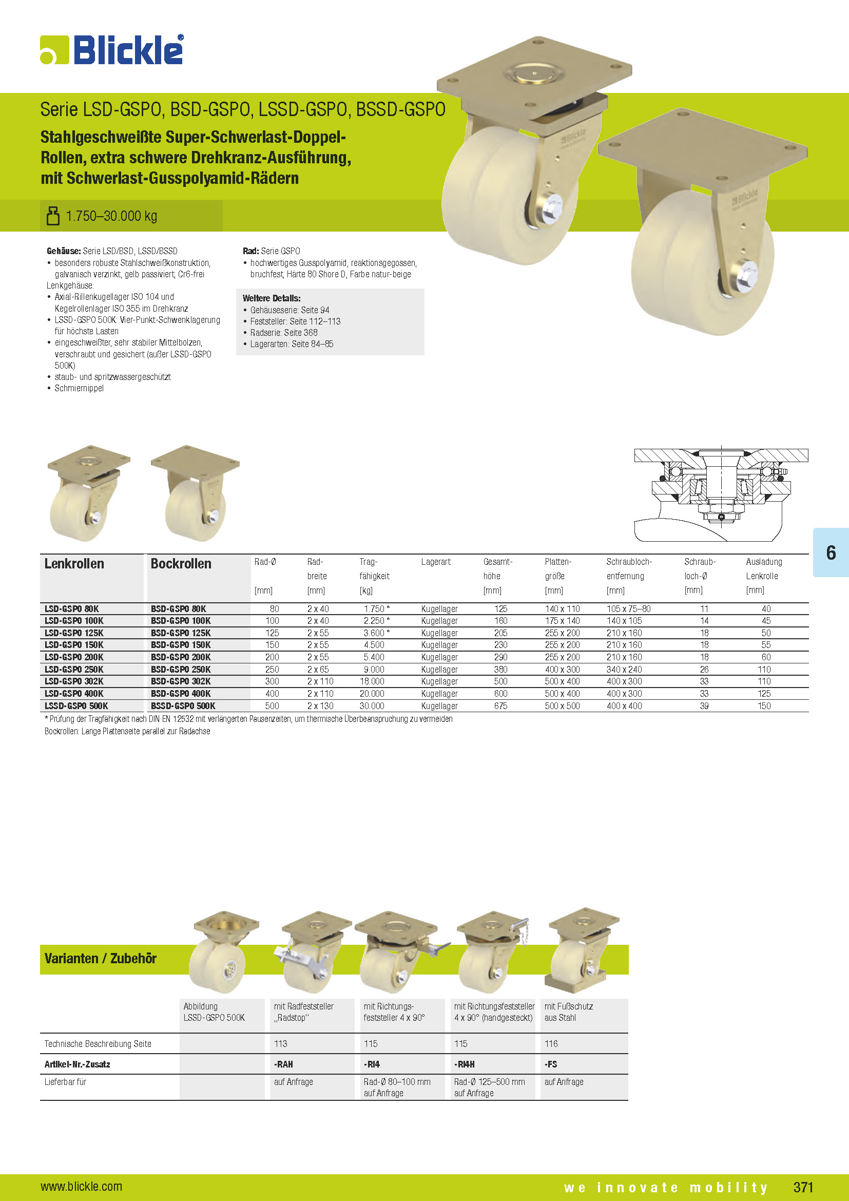 LSD-GSPO, BSD-GSPO, LSSD-GSPO, BSSD-GSPO Stahlgeschweißte Super-Schwerlast-Doppel- Rollen, extra schwere Drehkranz-Ausführung, mit Schwerlast-Gusspolyamid-Rädern