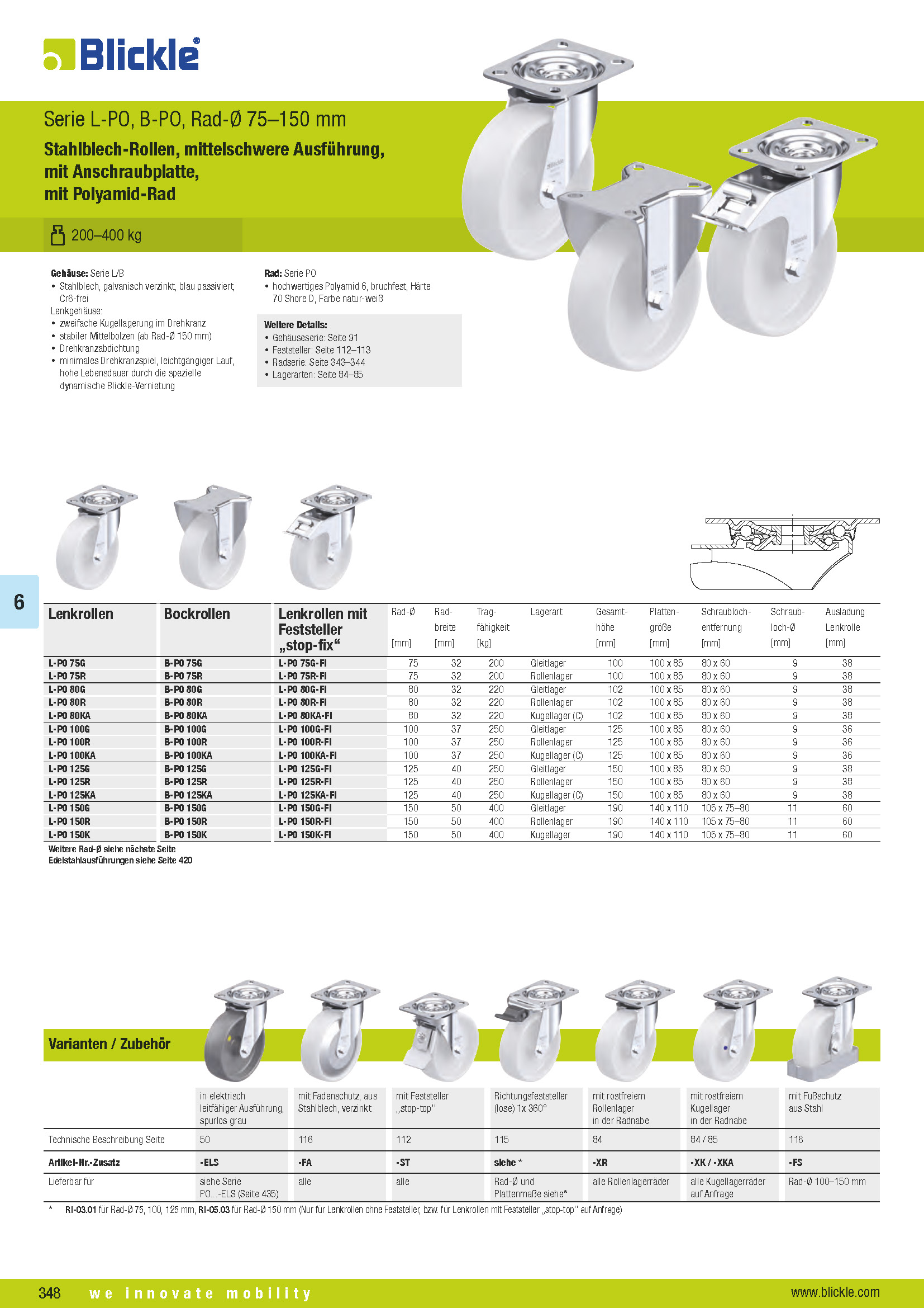 L-PO, B-PO, Rad-Ø 75–150 mm Stahlblech-Rollen, mittelschwere Ausführung, mit Anschraubplatte, mit Polyamid-Rad