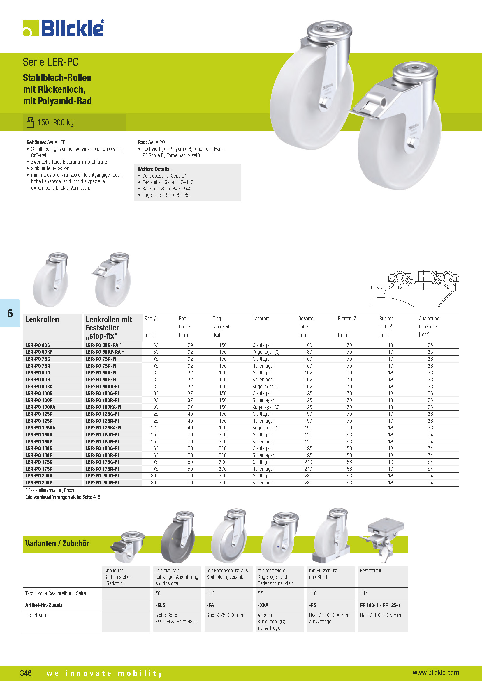 LER-PO Pressed steel castors with bolt hole, with nylon wheel
